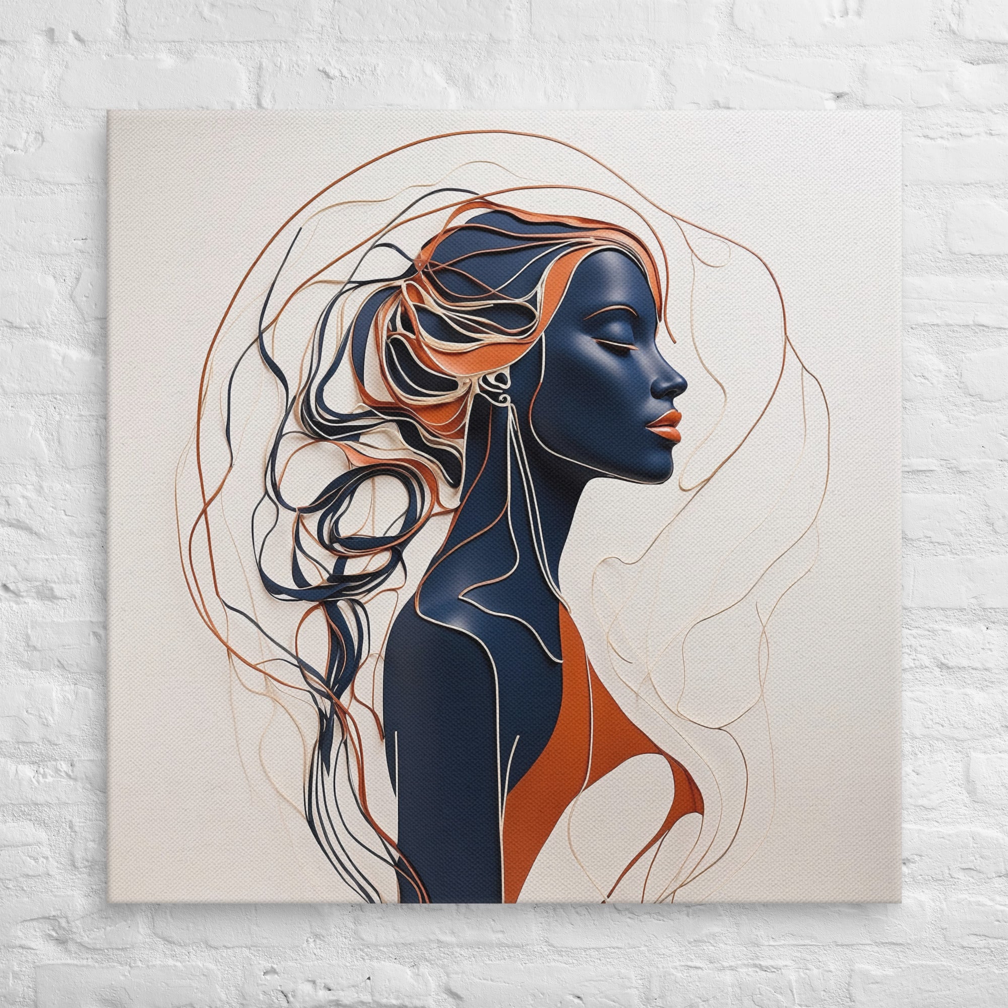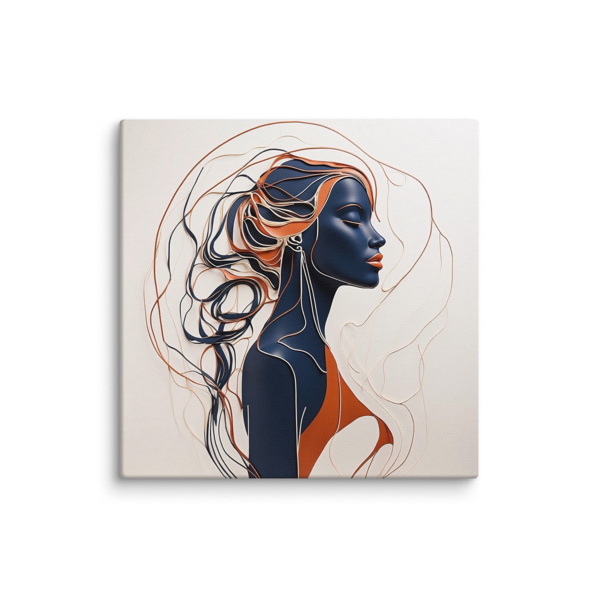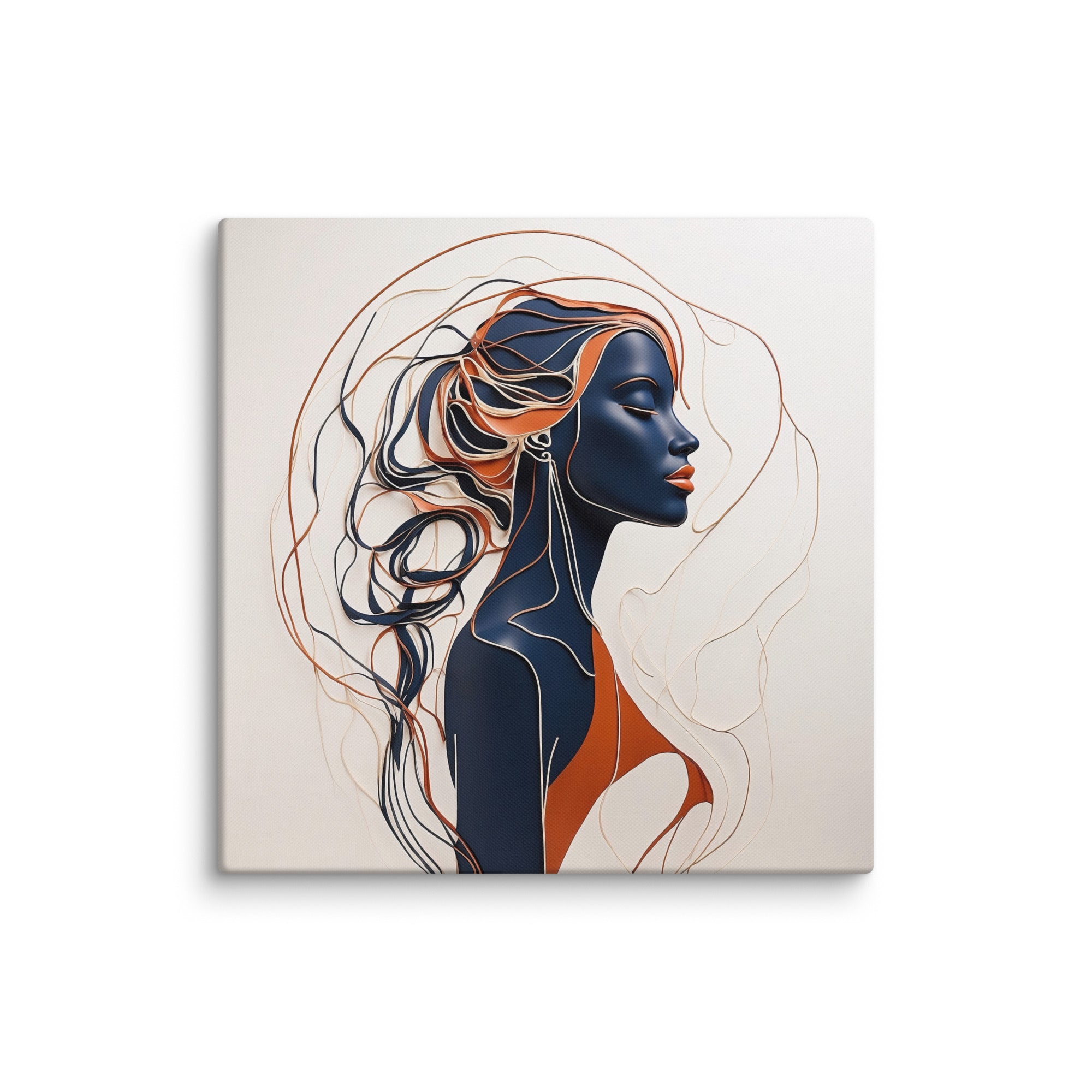 This striking artwork features a sophisticated female profile crafted in fluid navy, cream, and copper lines. The interplay of minimalism and depth creates a sense of calm and refinement—ideal for modern, boho, or contemporary interiors.