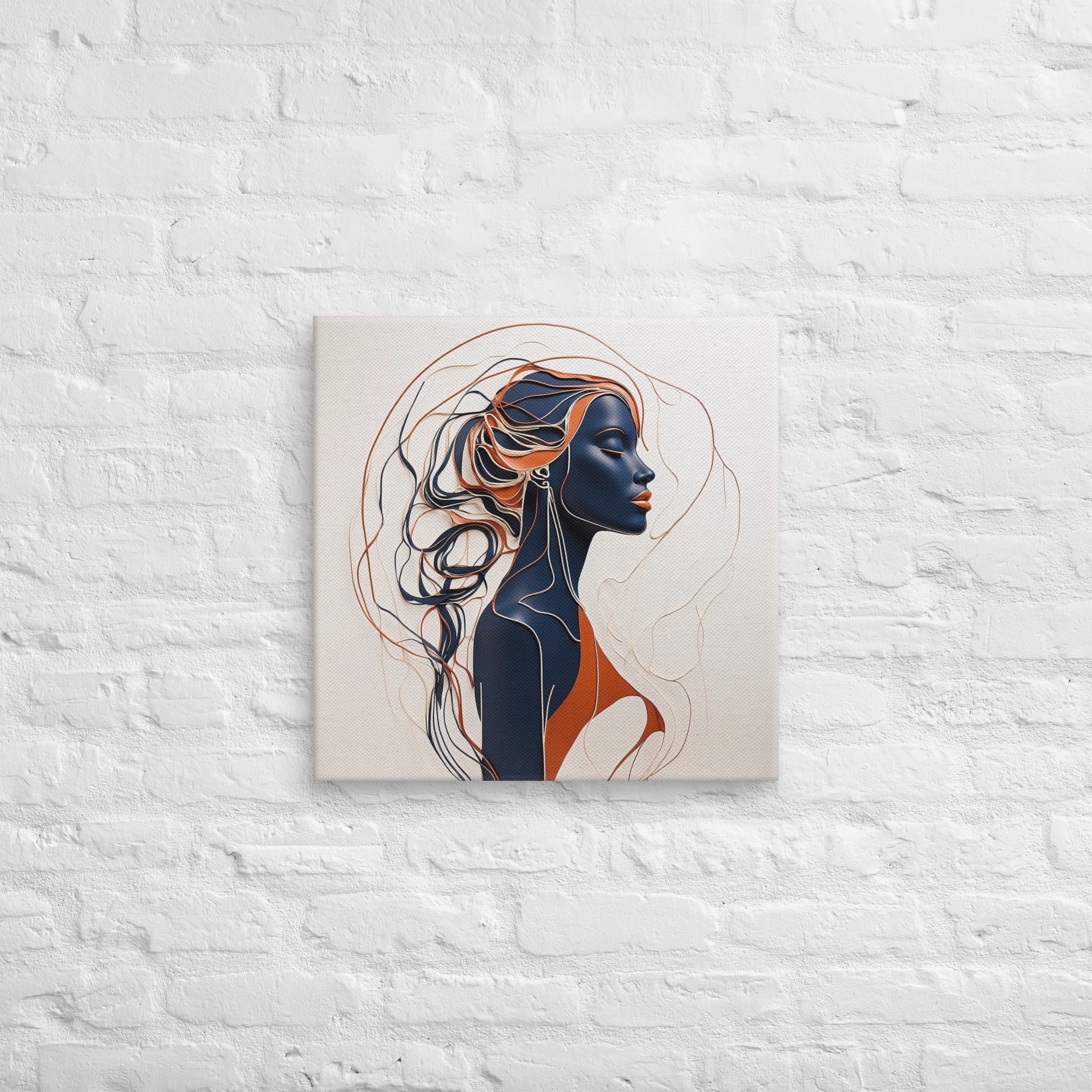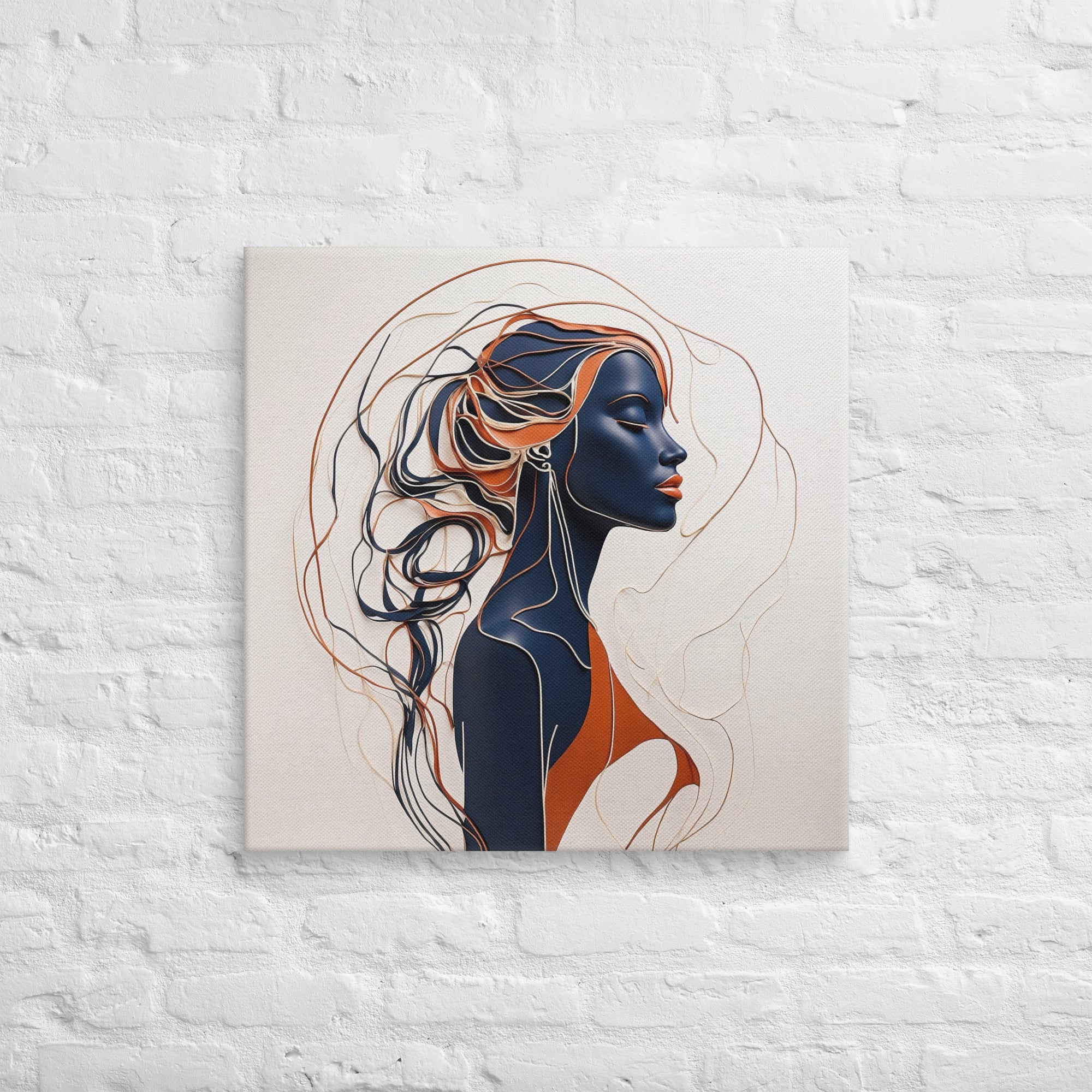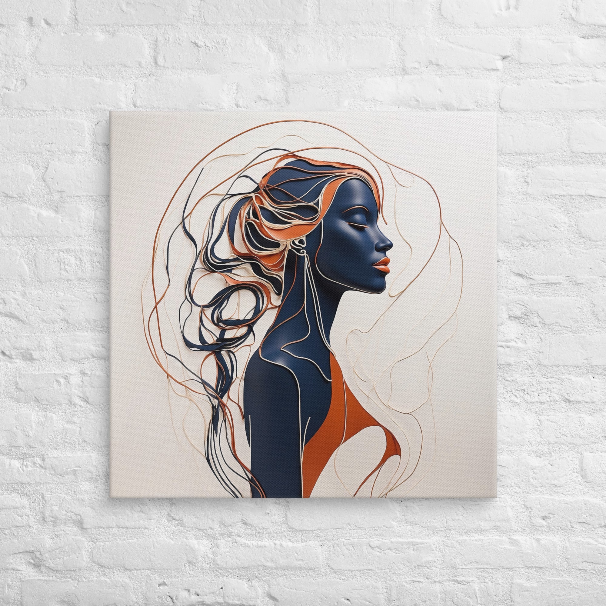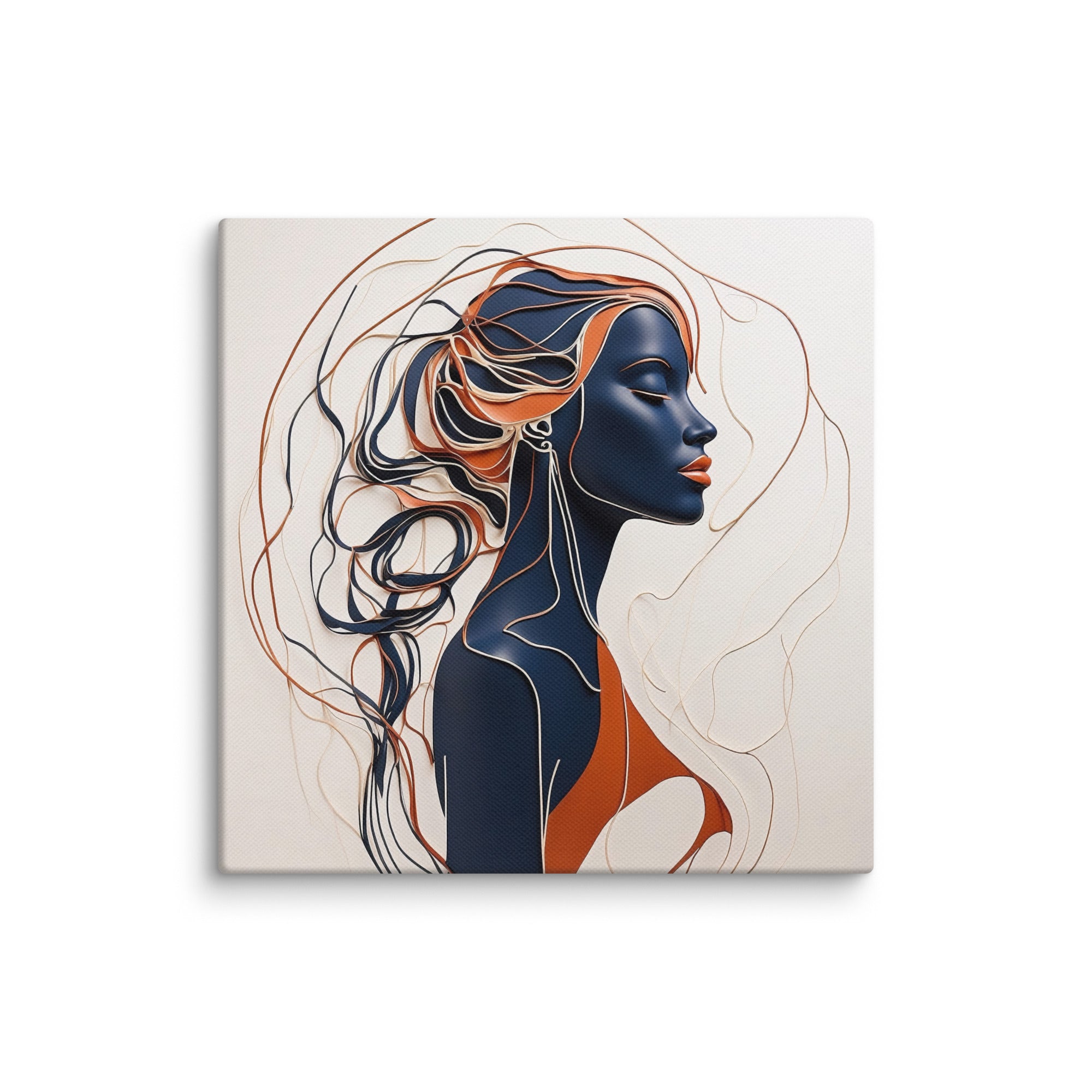 This striking artwork features a sophisticated female profile crafted in fluid navy, cream, and copper lines. The interplay of minimalism and depth creates a sense of calm and refinement—ideal for modern, boho, or contemporary interiors.