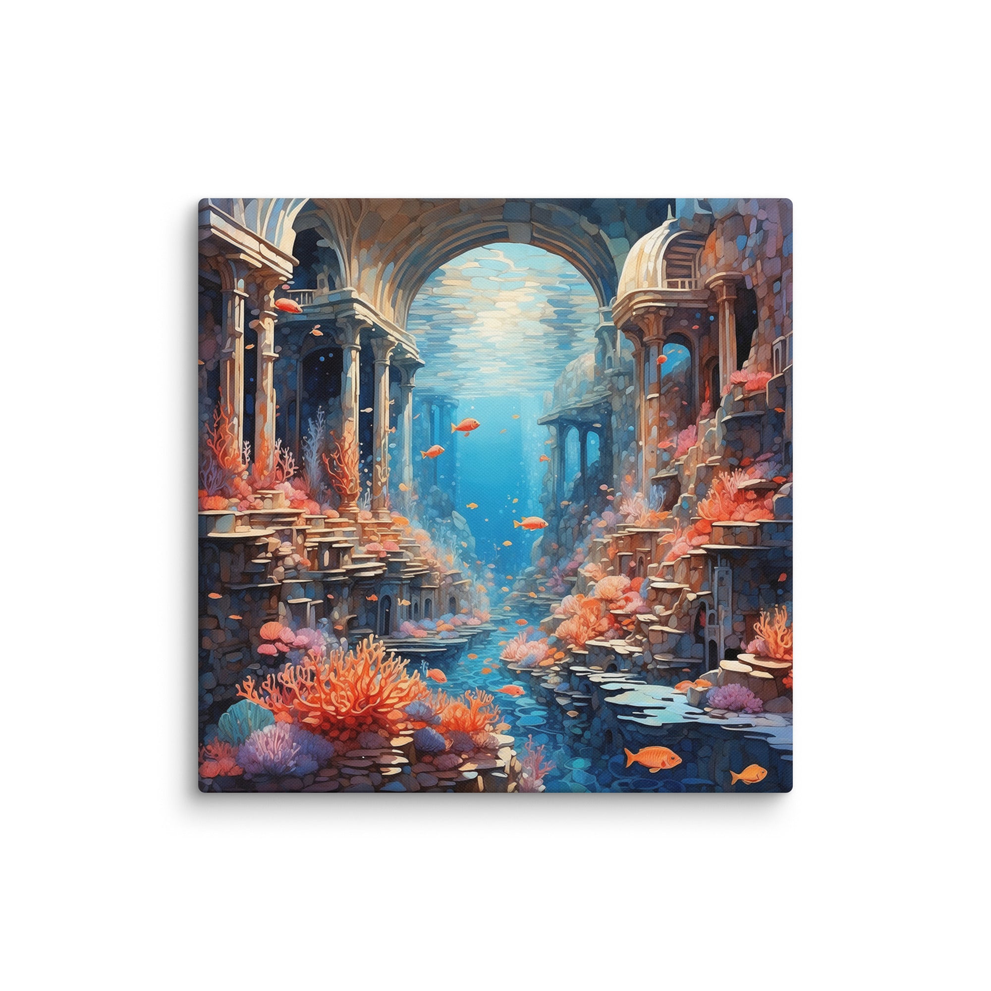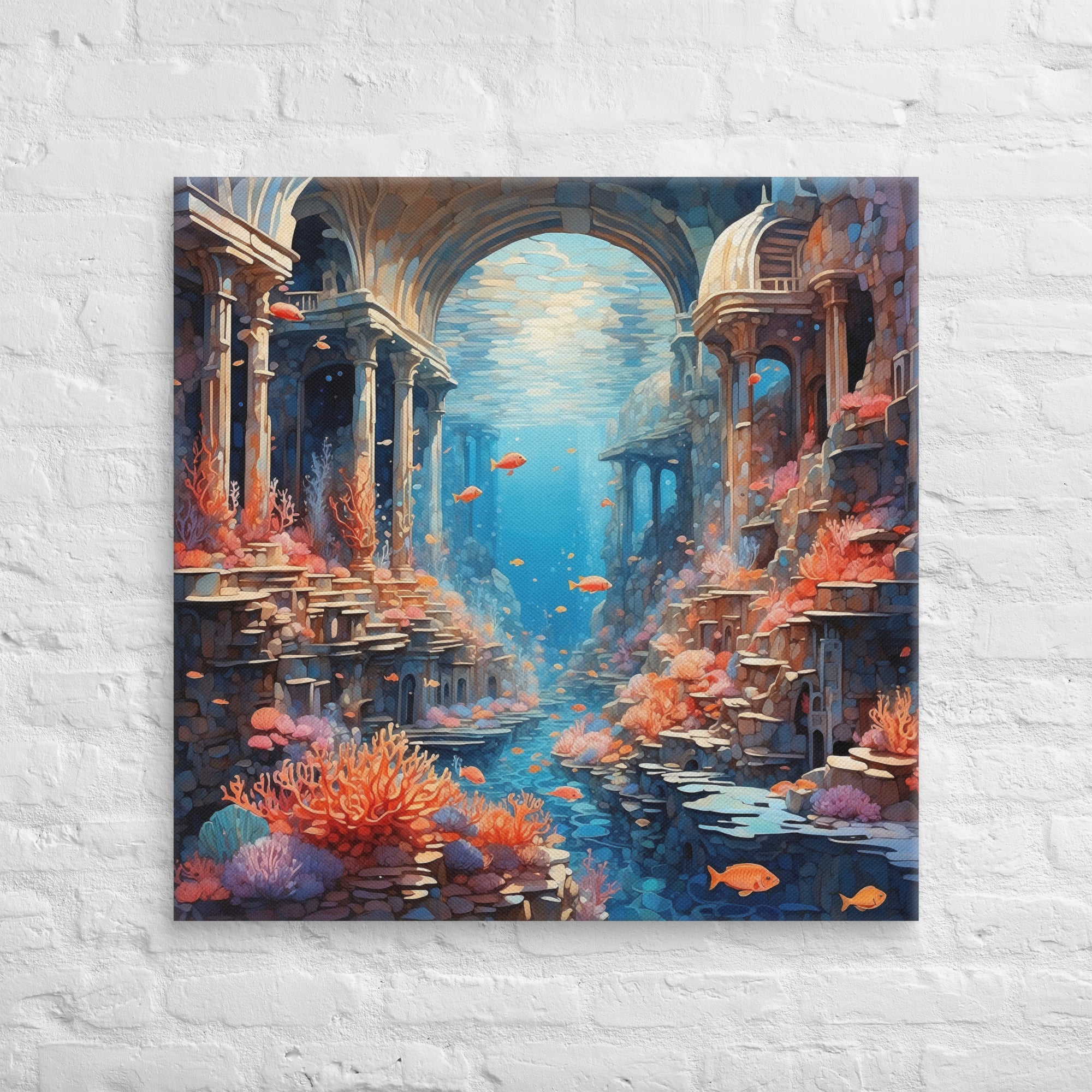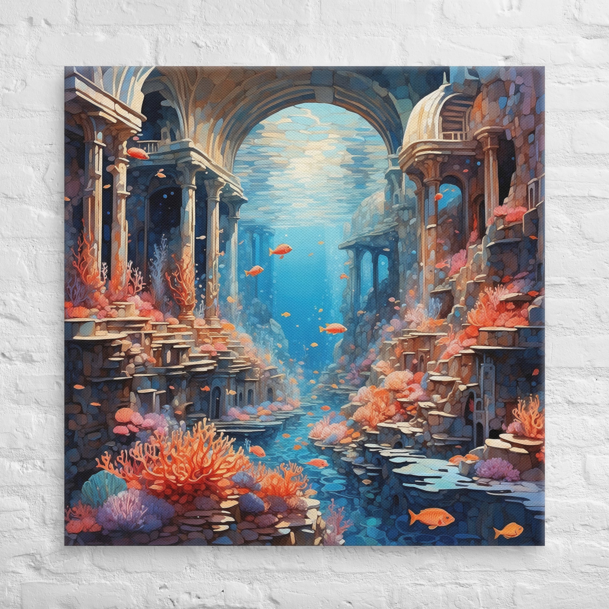 This mesmerizing canvas portrays an ancient underwater city bathed in glowing blue light and surrounded by vibrant coral reefs. Schools of orange fish swim gracefully through stone archways, creating a tranquil and magical oceanic ambiance for your decor.