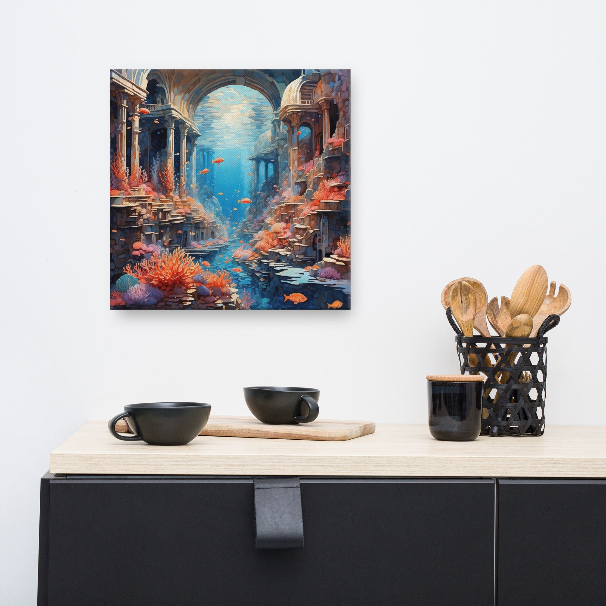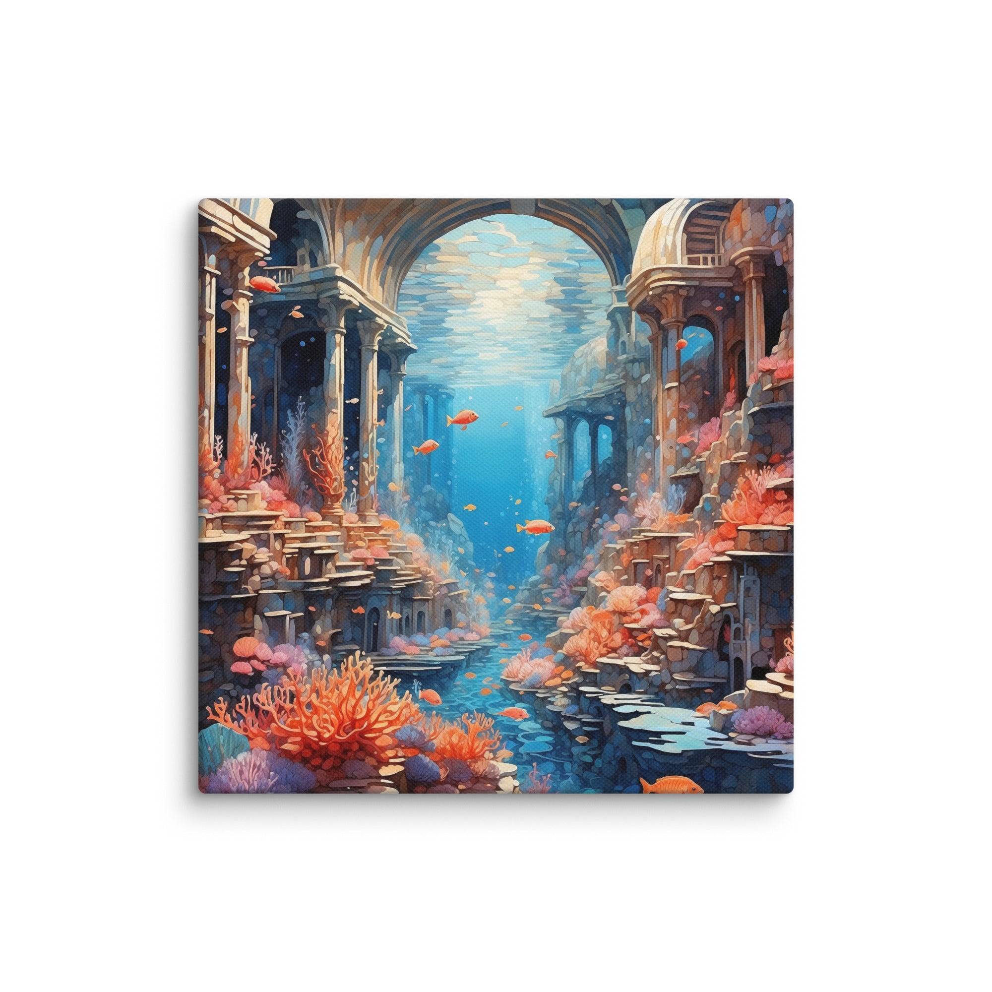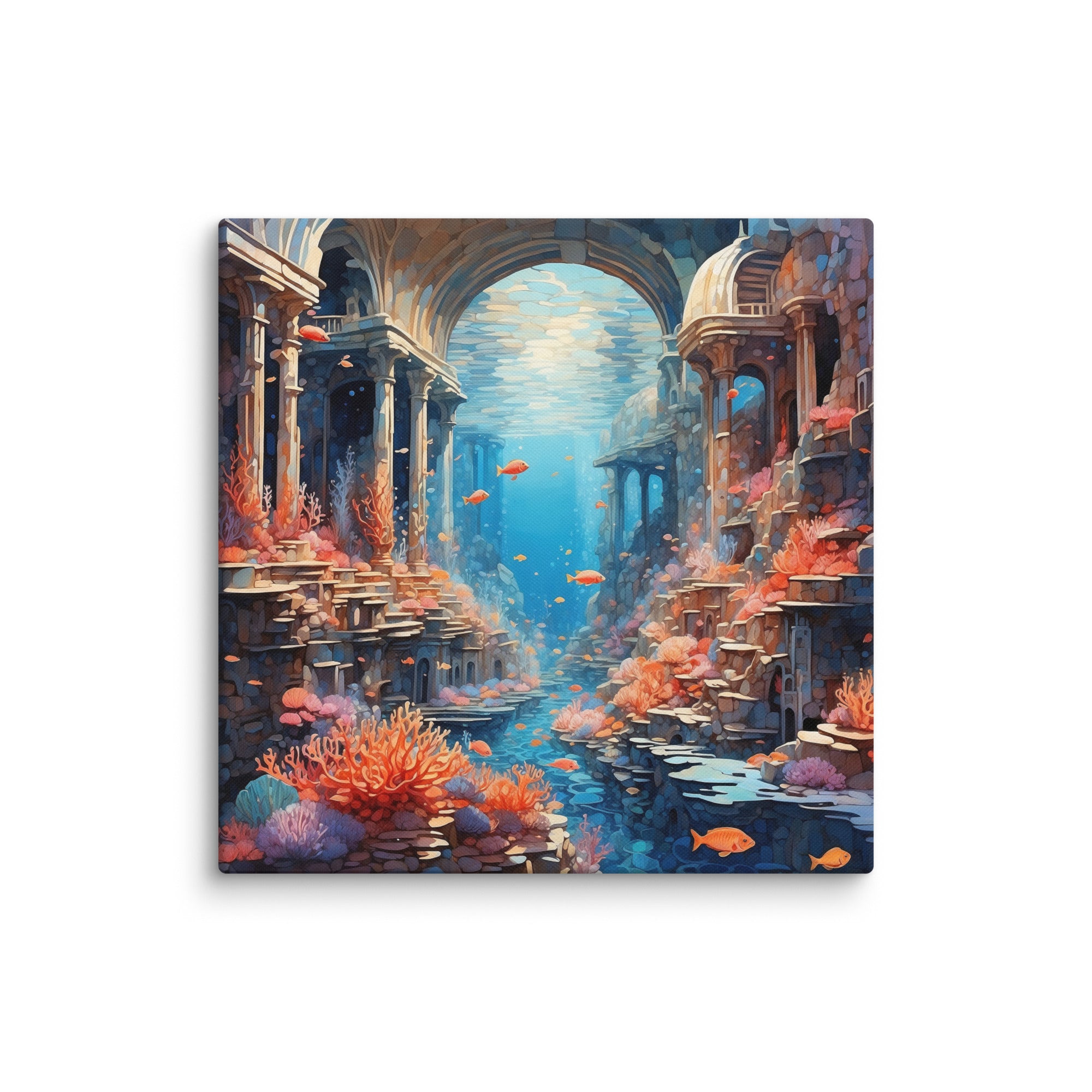This mesmerizing canvas portrays an ancient underwater city bathed in glowing blue light and surrounded by vibrant coral reefs. Schools of orange fish swim gracefully through stone archways, creating a tranquil and magical oceanic ambiance for your decor.