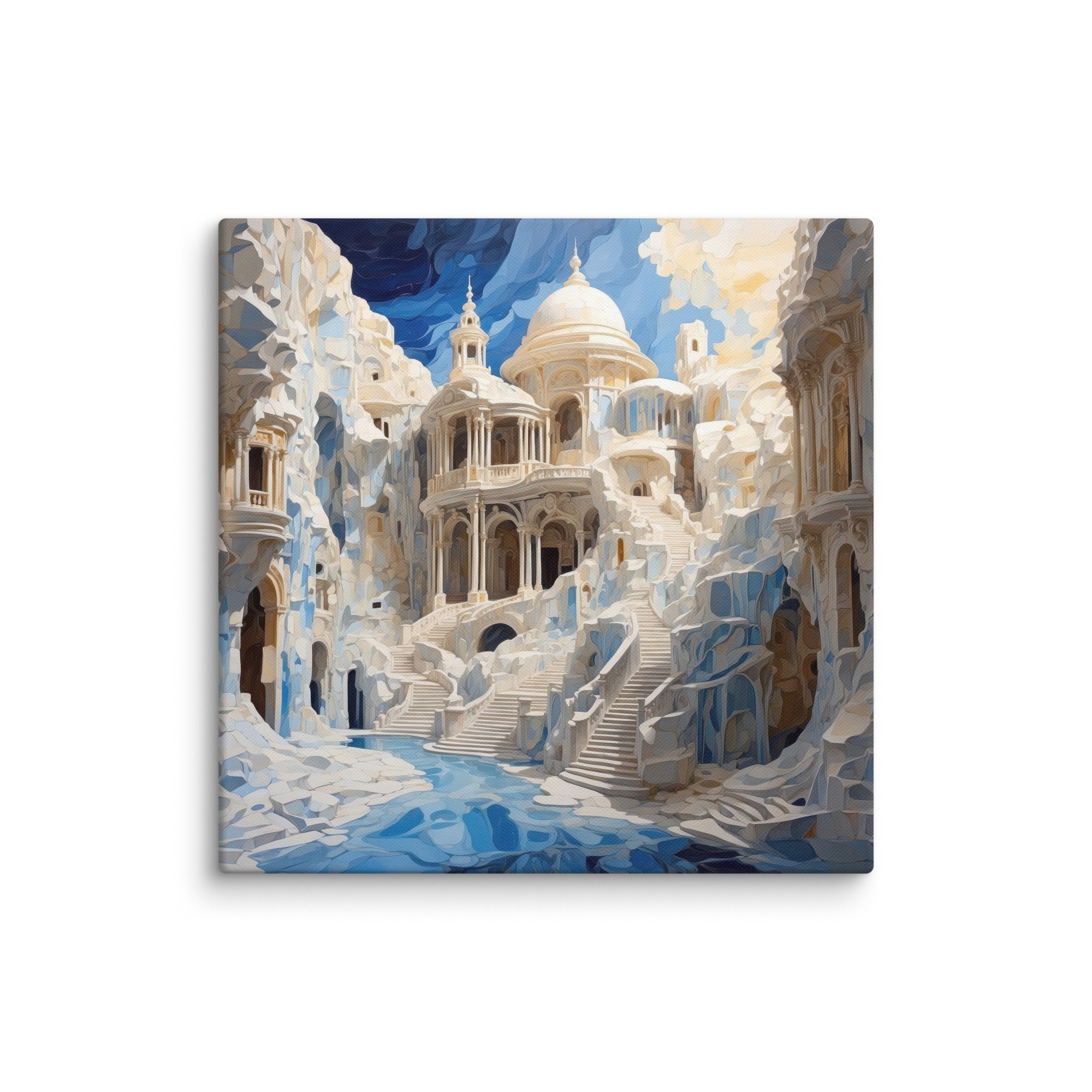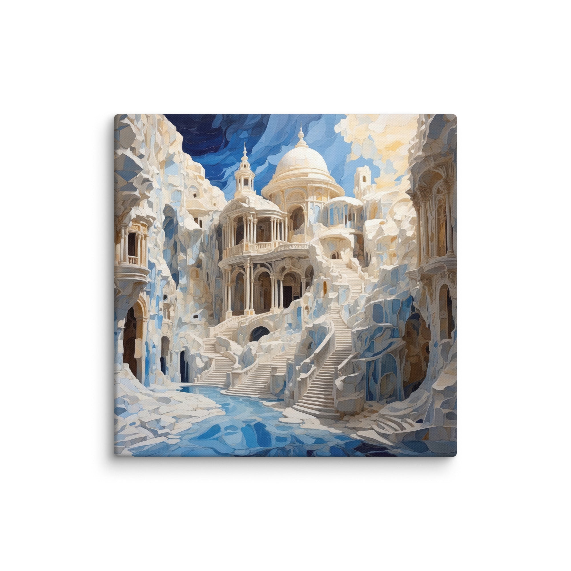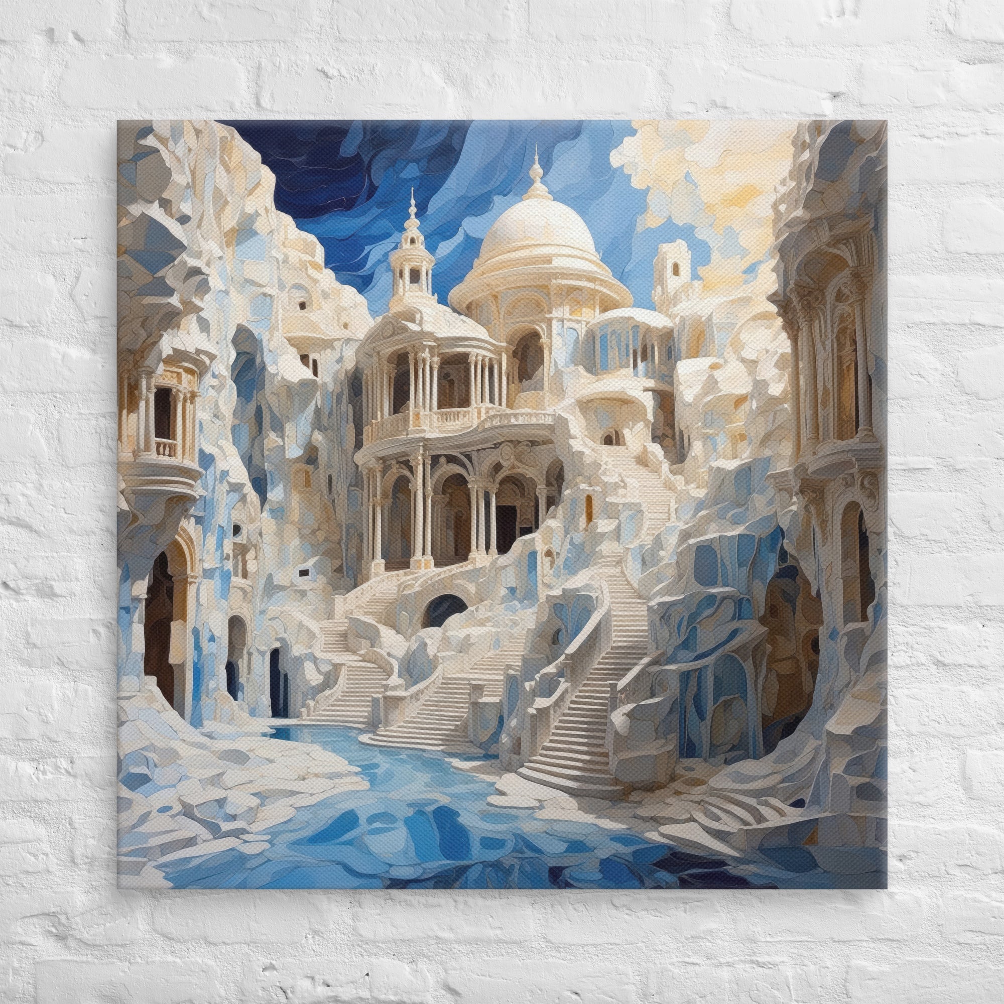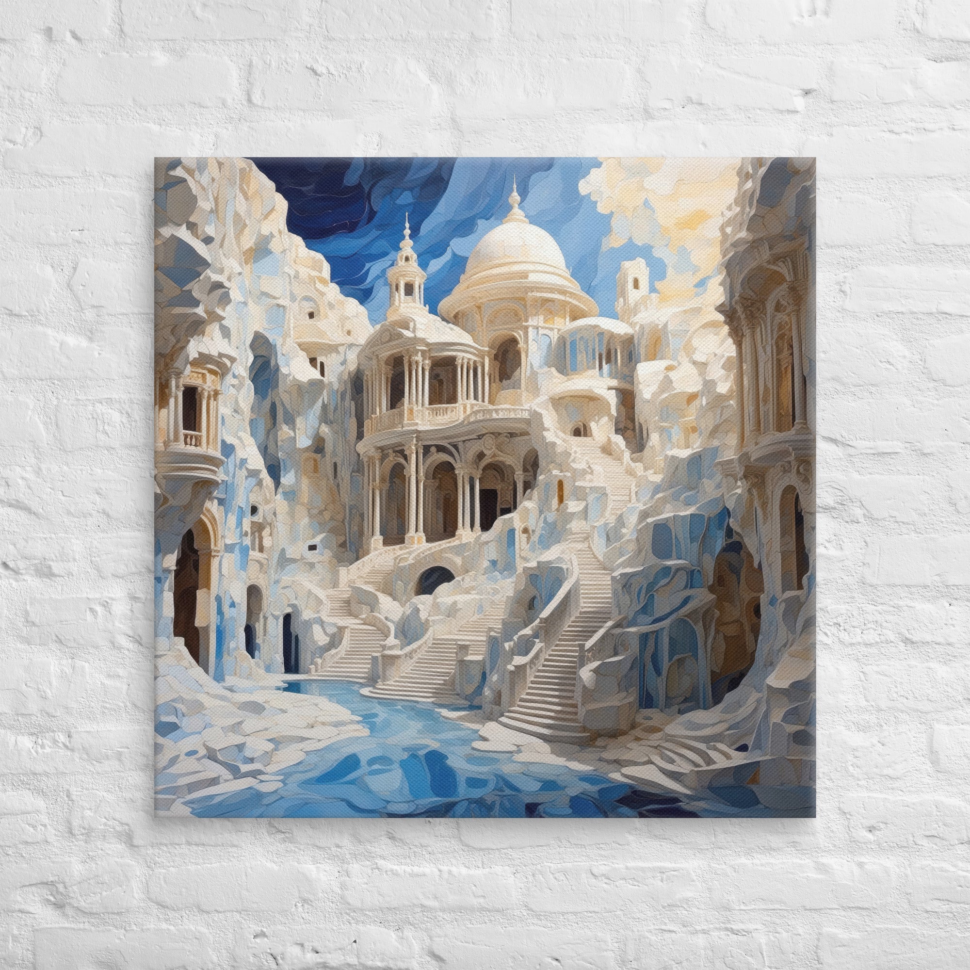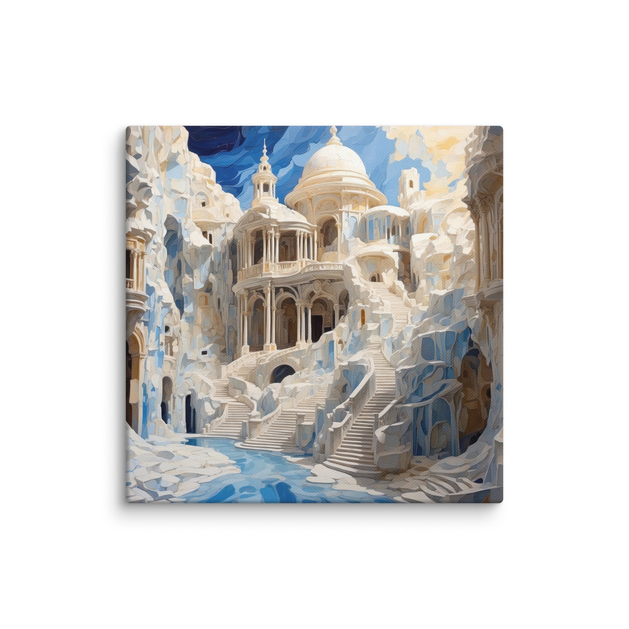 This breathtaking canvas captures an ethereal marble palace bathed in shades of cream, ivory, and soft blue. With its intricate domes, arches, and staircases, it evokes a dreamlike serenity and grandeur, ideal for elegant and timeless interior spaces.