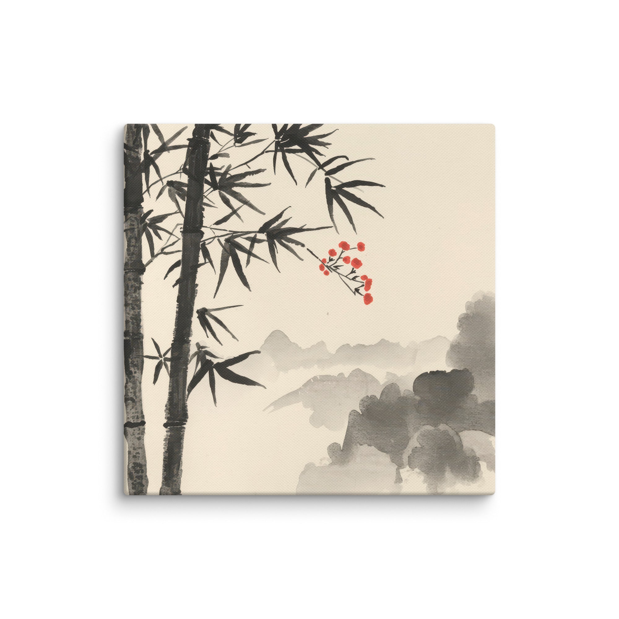 A peaceful Japanese ink-style painting depicting slender bamboo stalks with red blossoms overlooking soft gray mist and distant mountains. The minimalist brushwork and balanced tones embody harmony and calm, ideal for zen-inspired rooms, meditation spaces, or modern interiors.