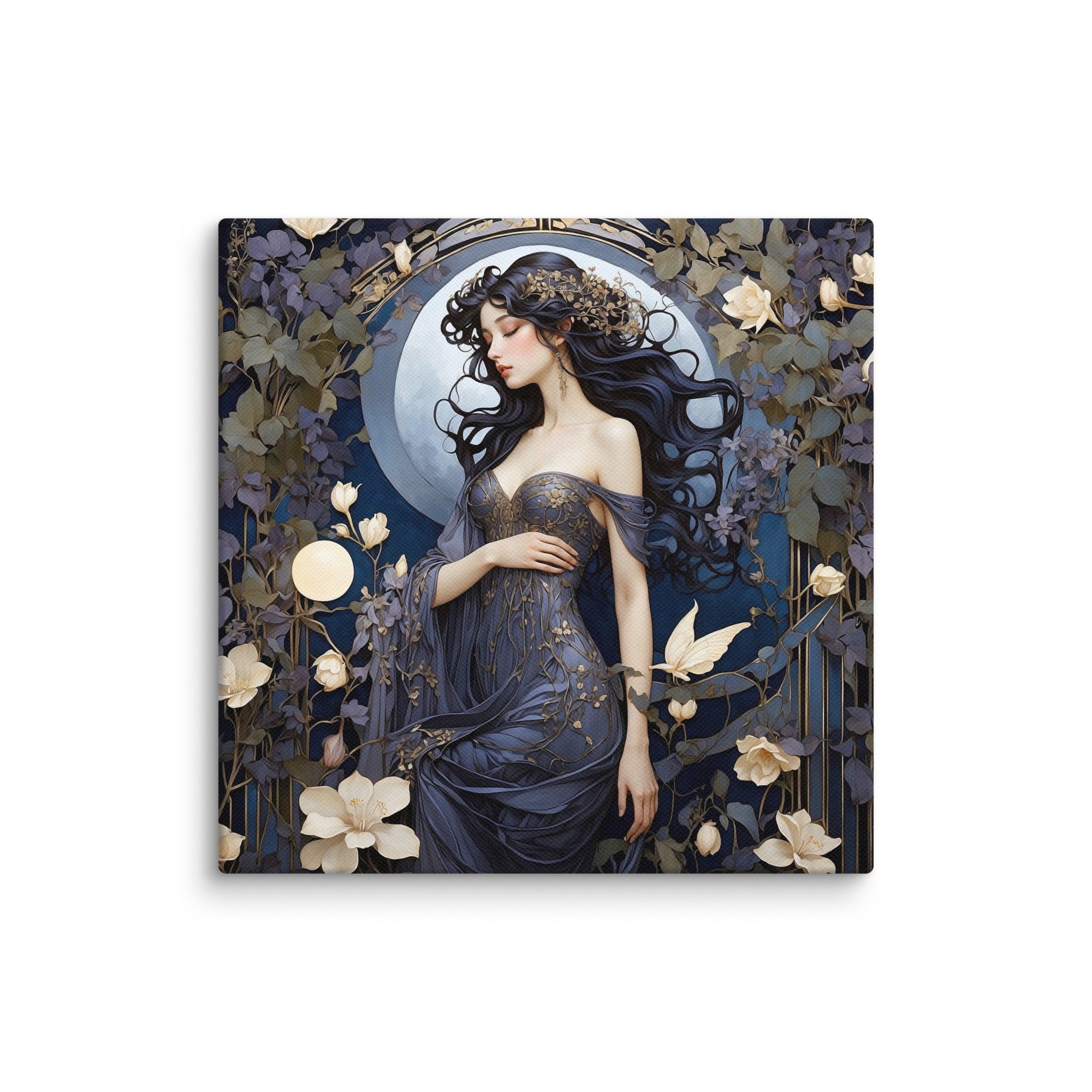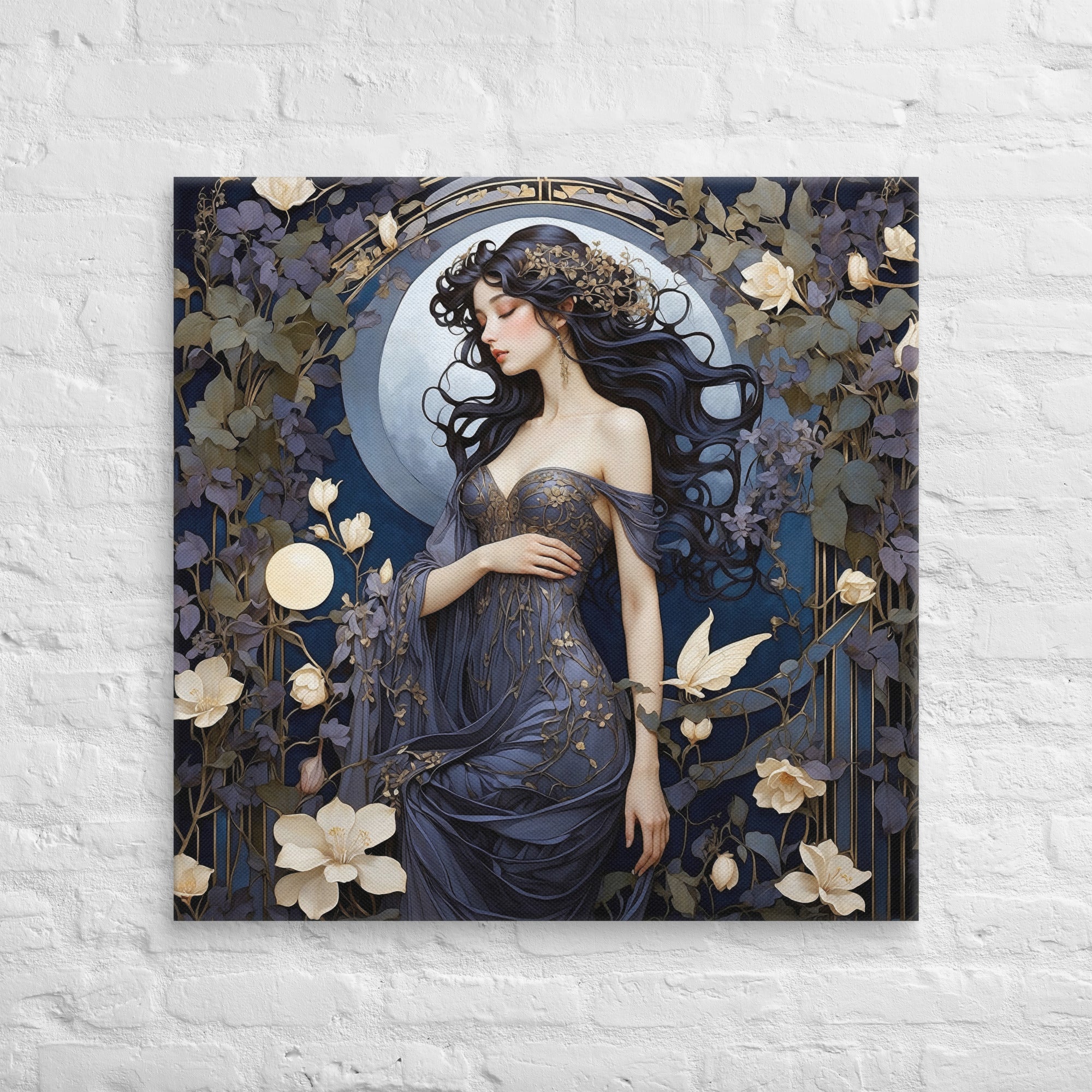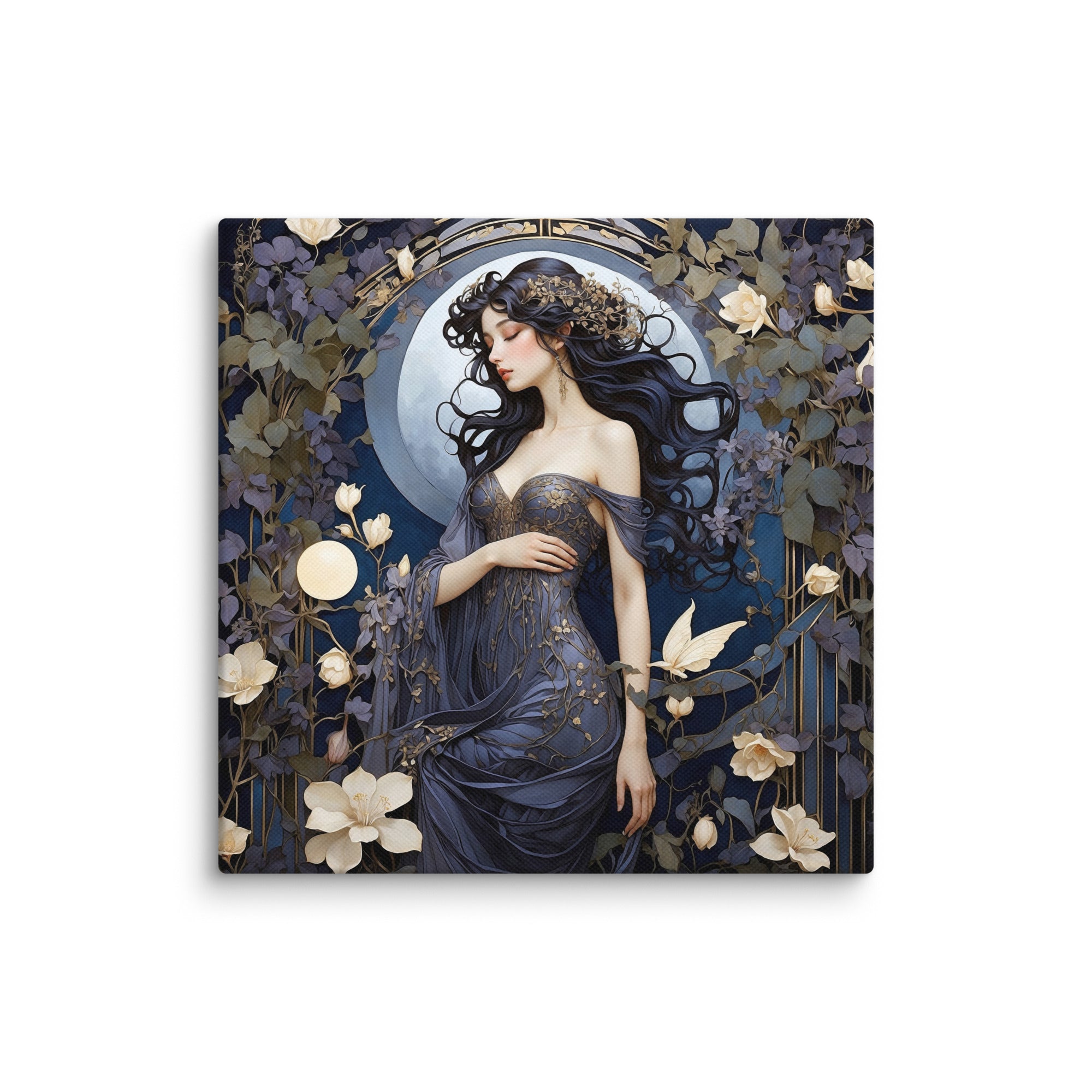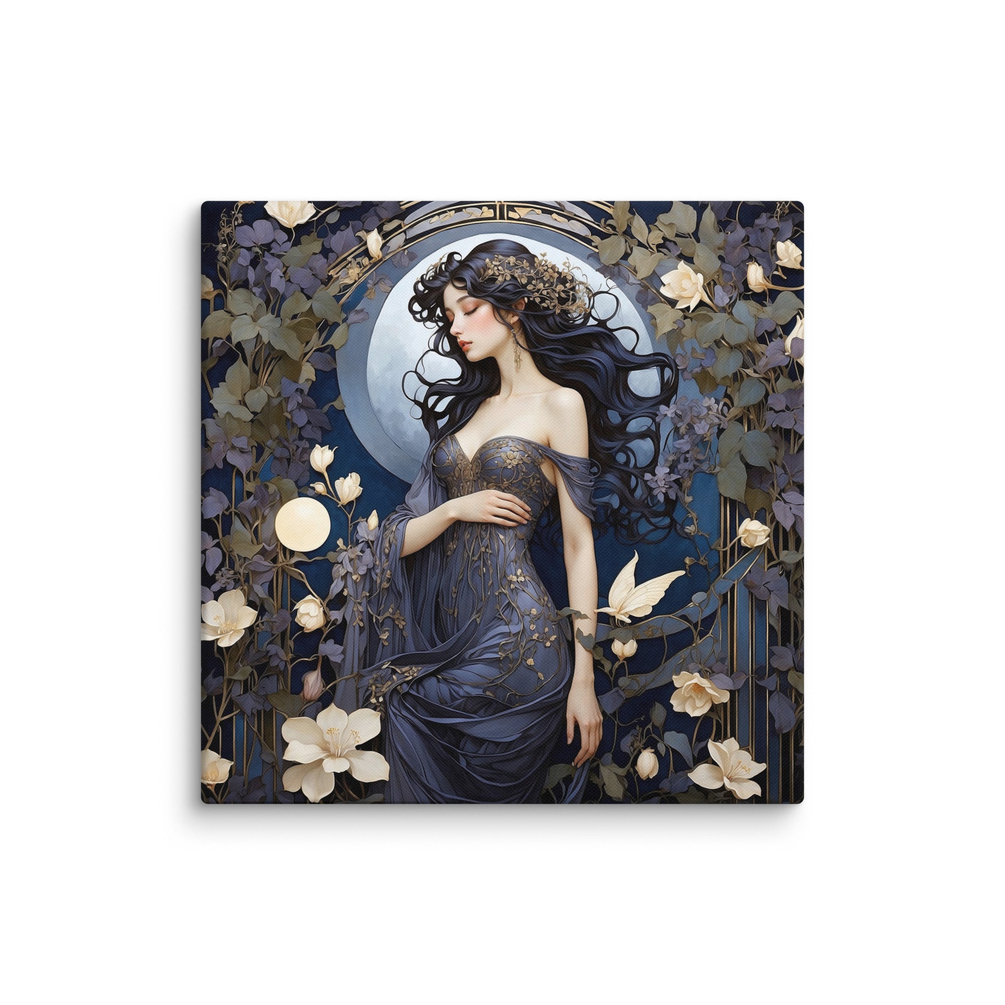 This ethereal artwork portrays an elegant woman bathed in moonlight, surrounded by flowing vines and pale blossoms. Inspired by Art Nouveau grace, the deep blue tones and golden details evoke romance and mystery—ideal for bedrooms or refined interiors.