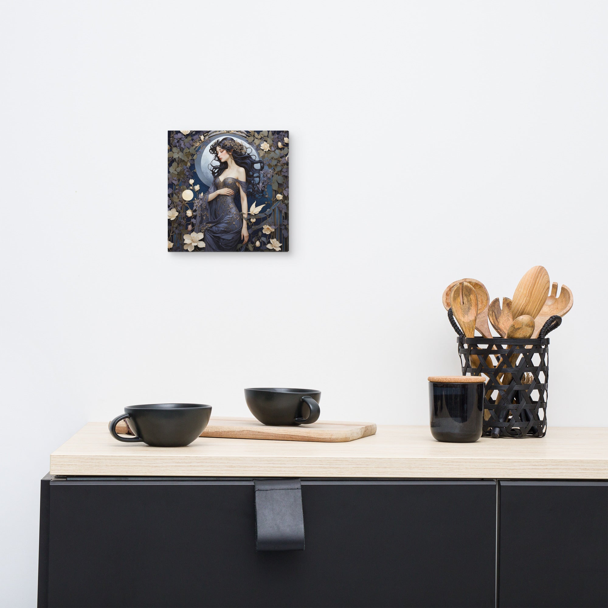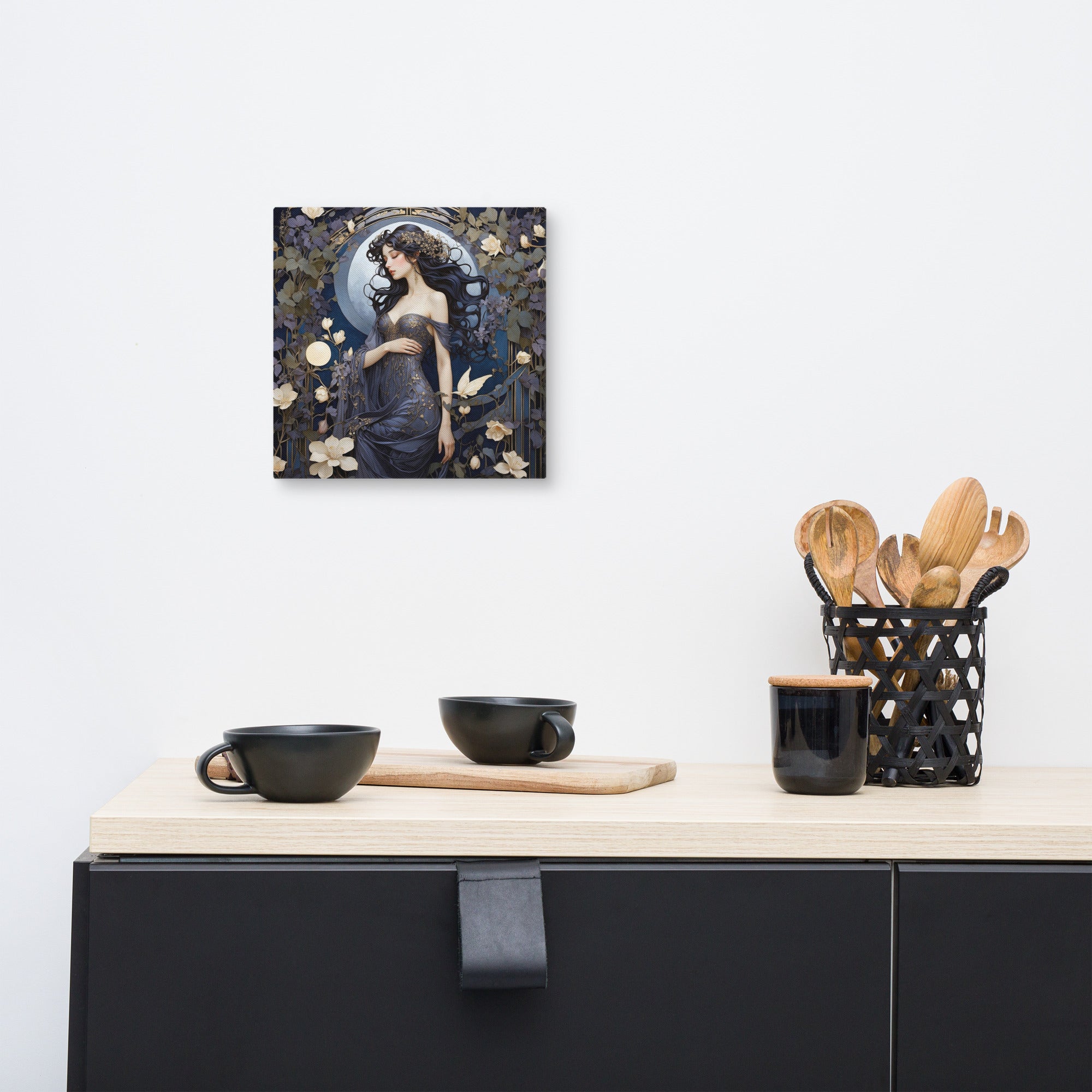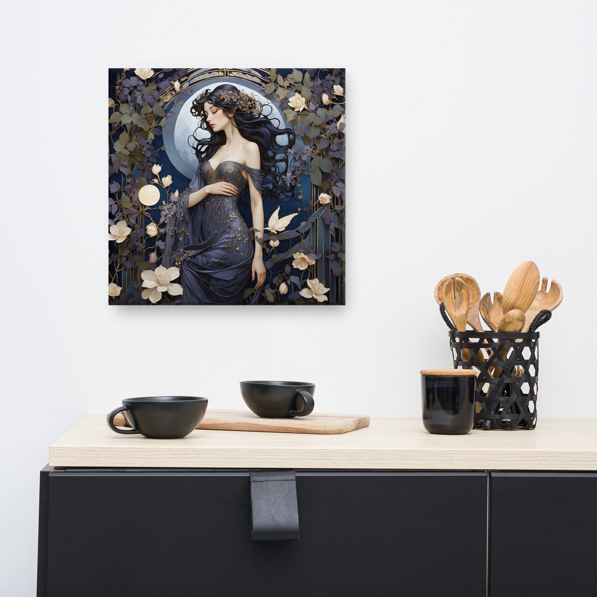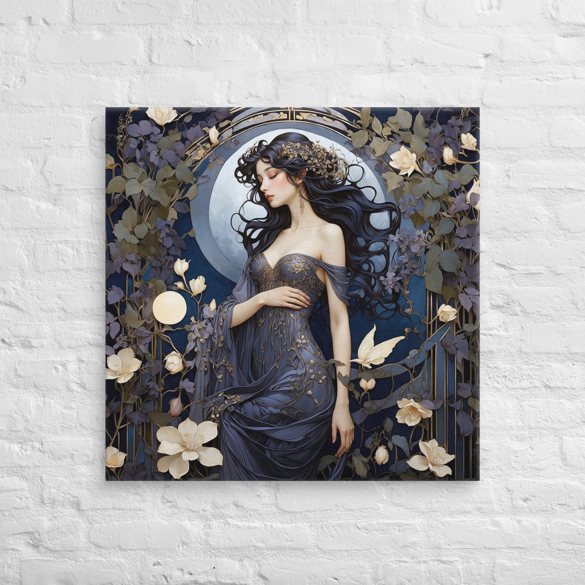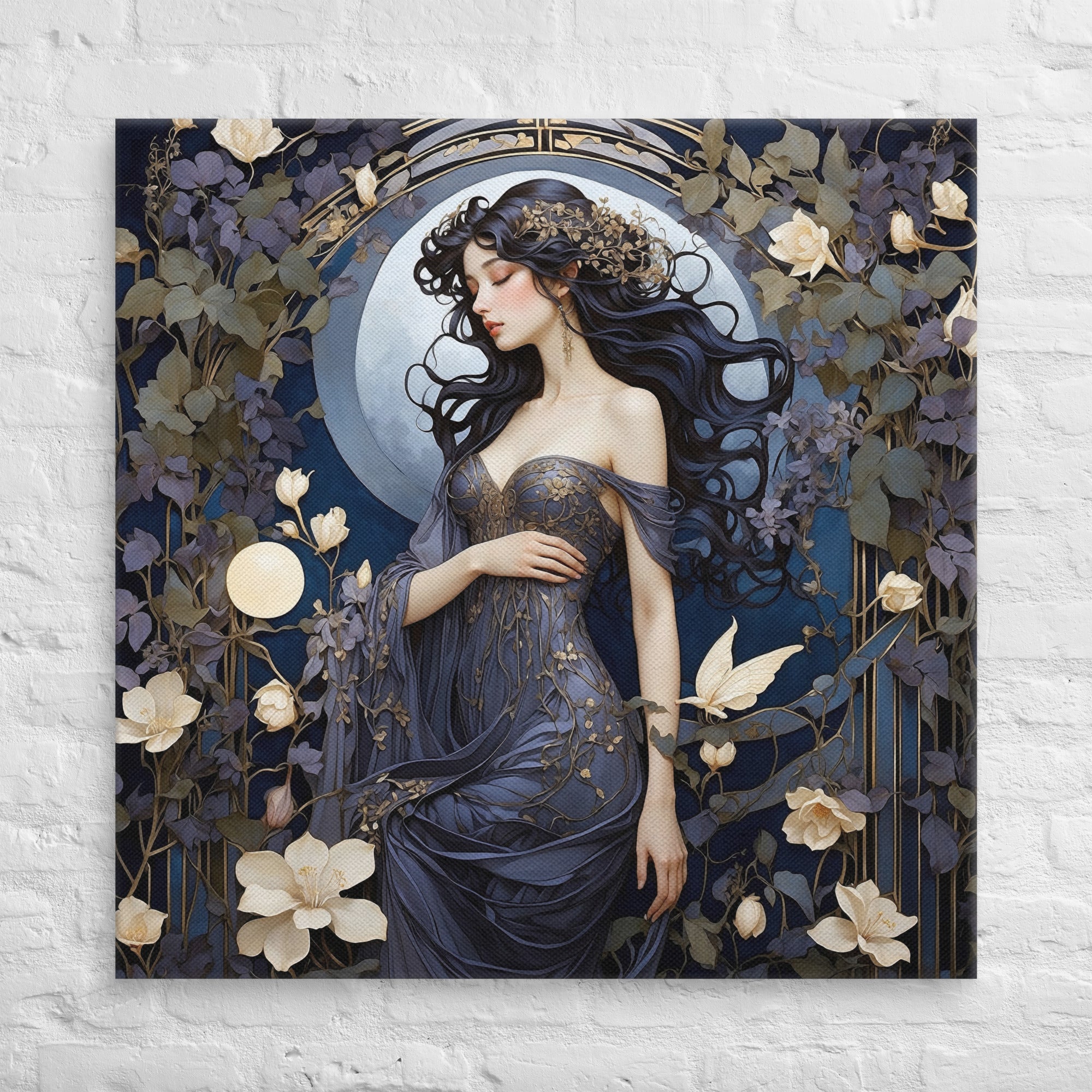 This ethereal artwork portrays an elegant woman bathed in moonlight, surrounded by flowing vines and pale blossoms. Inspired by Art Nouveau grace, the deep blue tones and golden details evoke romance and mystery—ideal for bedrooms or refined interiors.
