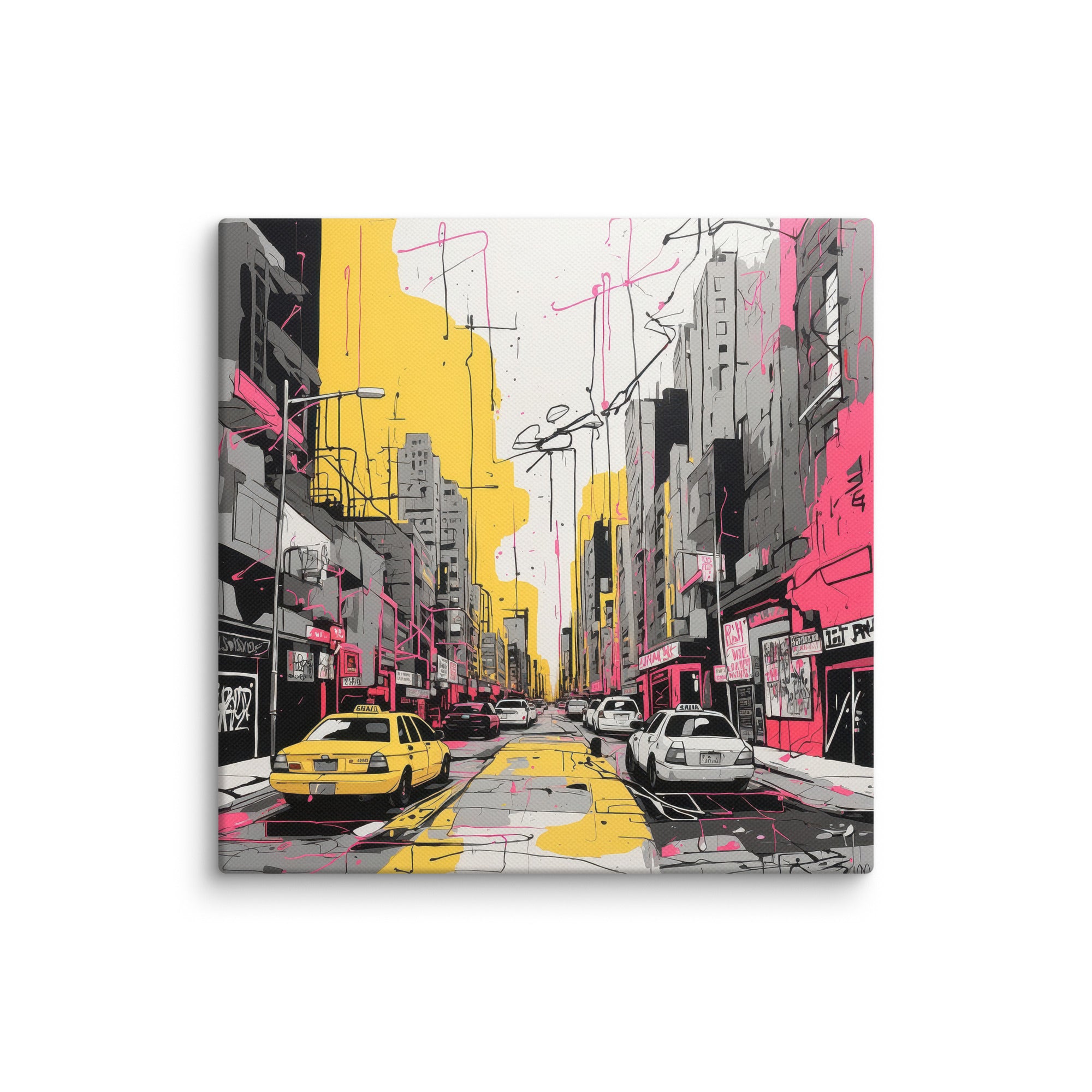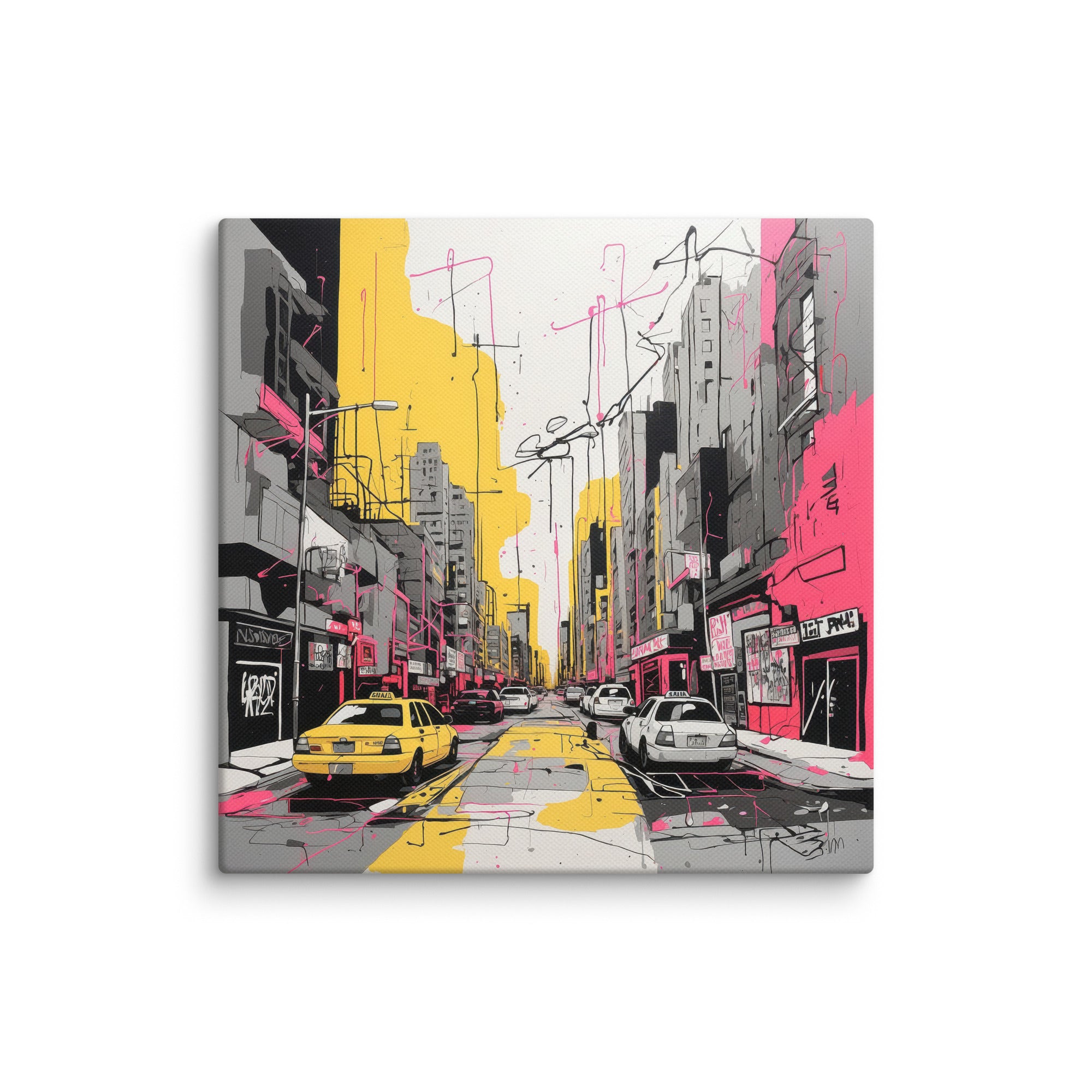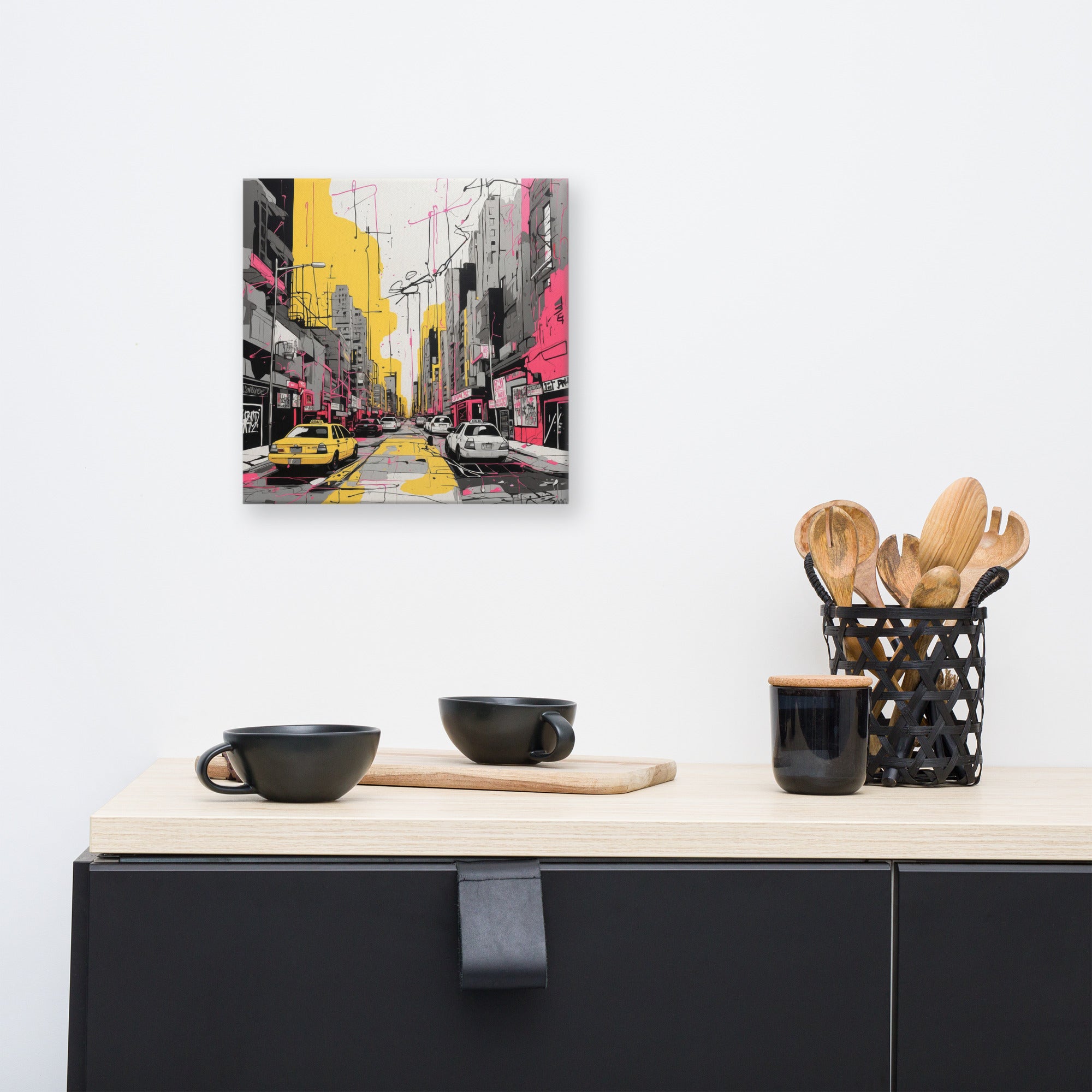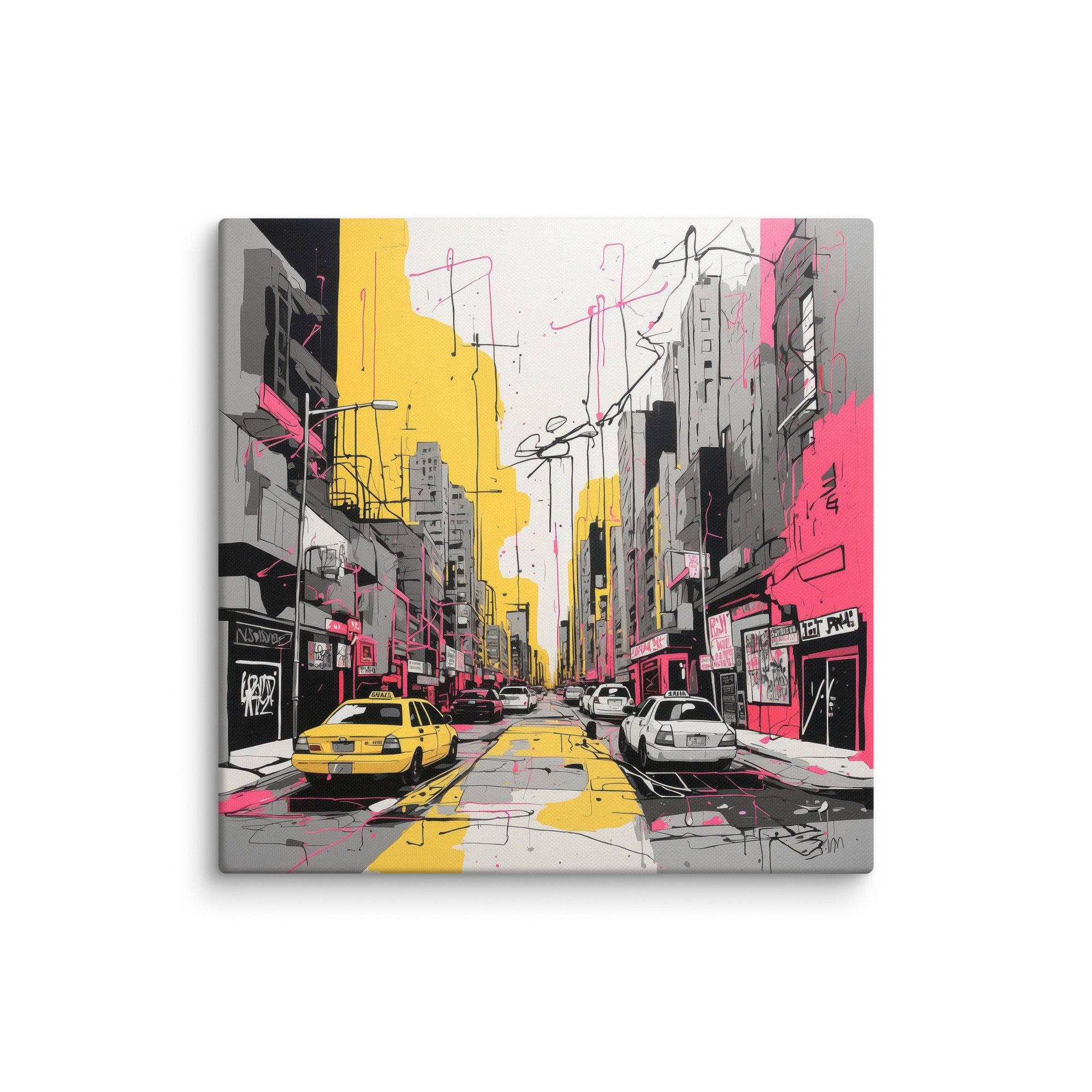 A bold urban artwork capturing a busy city street lined with taxis and skyscrapers, reimagined in striking neon pink, yellow, and gray tones. The energetic color palette and graphic pop-art style bring a dynamic, modern edge to any interior. Ideal for studios, offices, or contemporary living spaces.