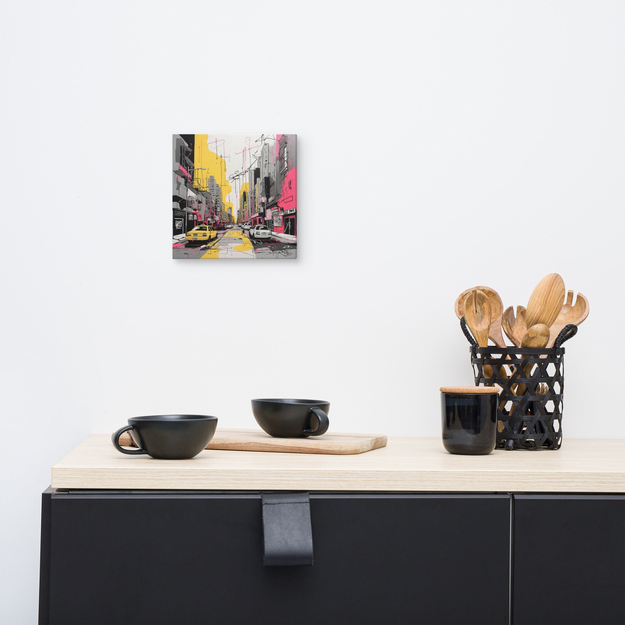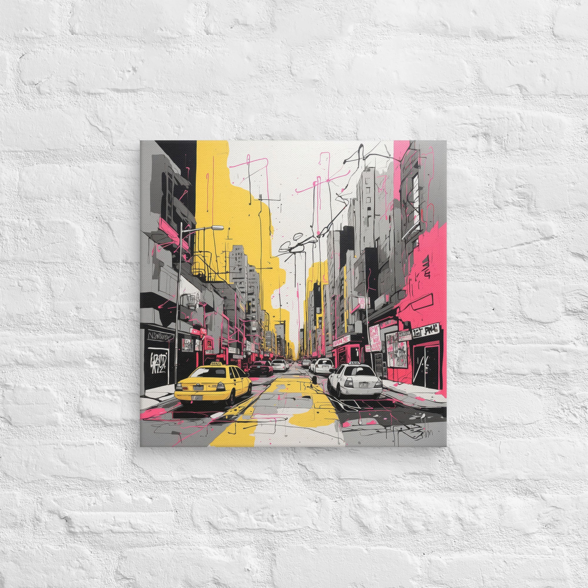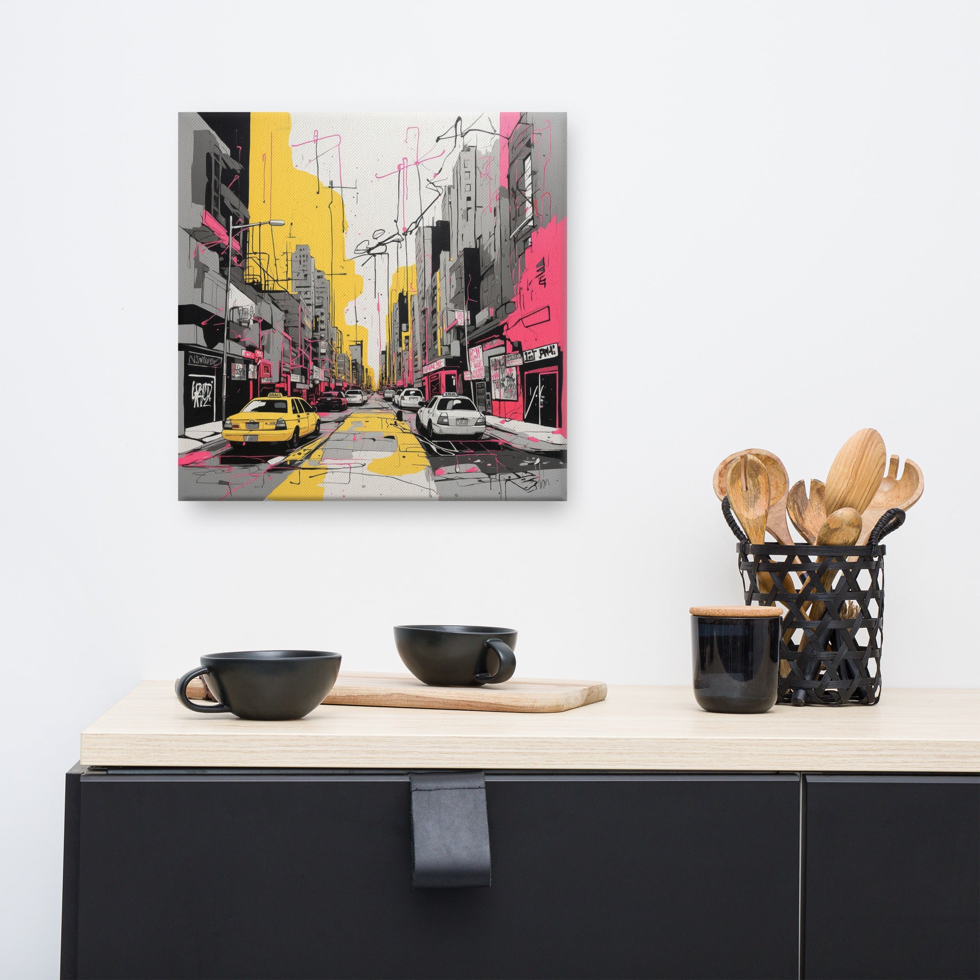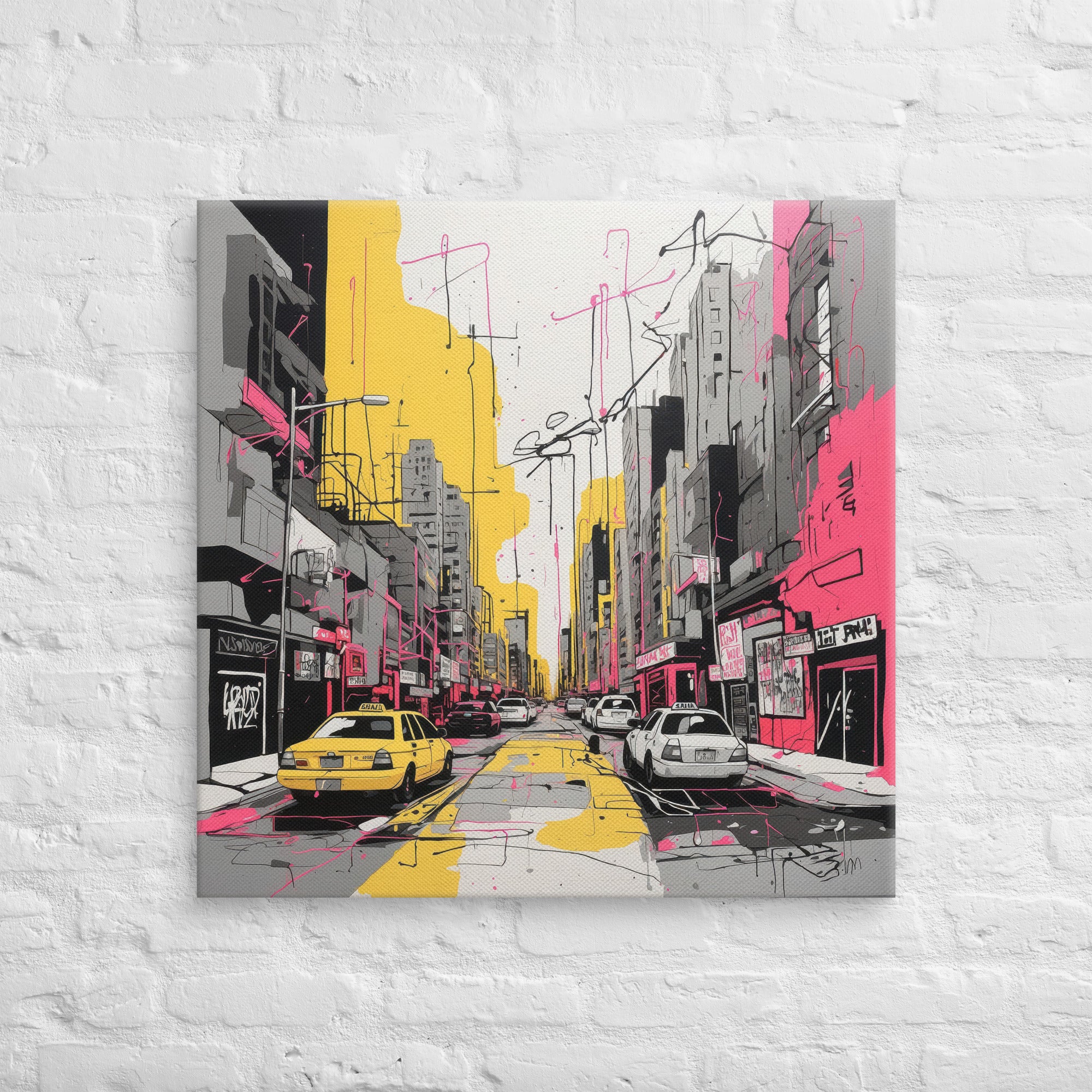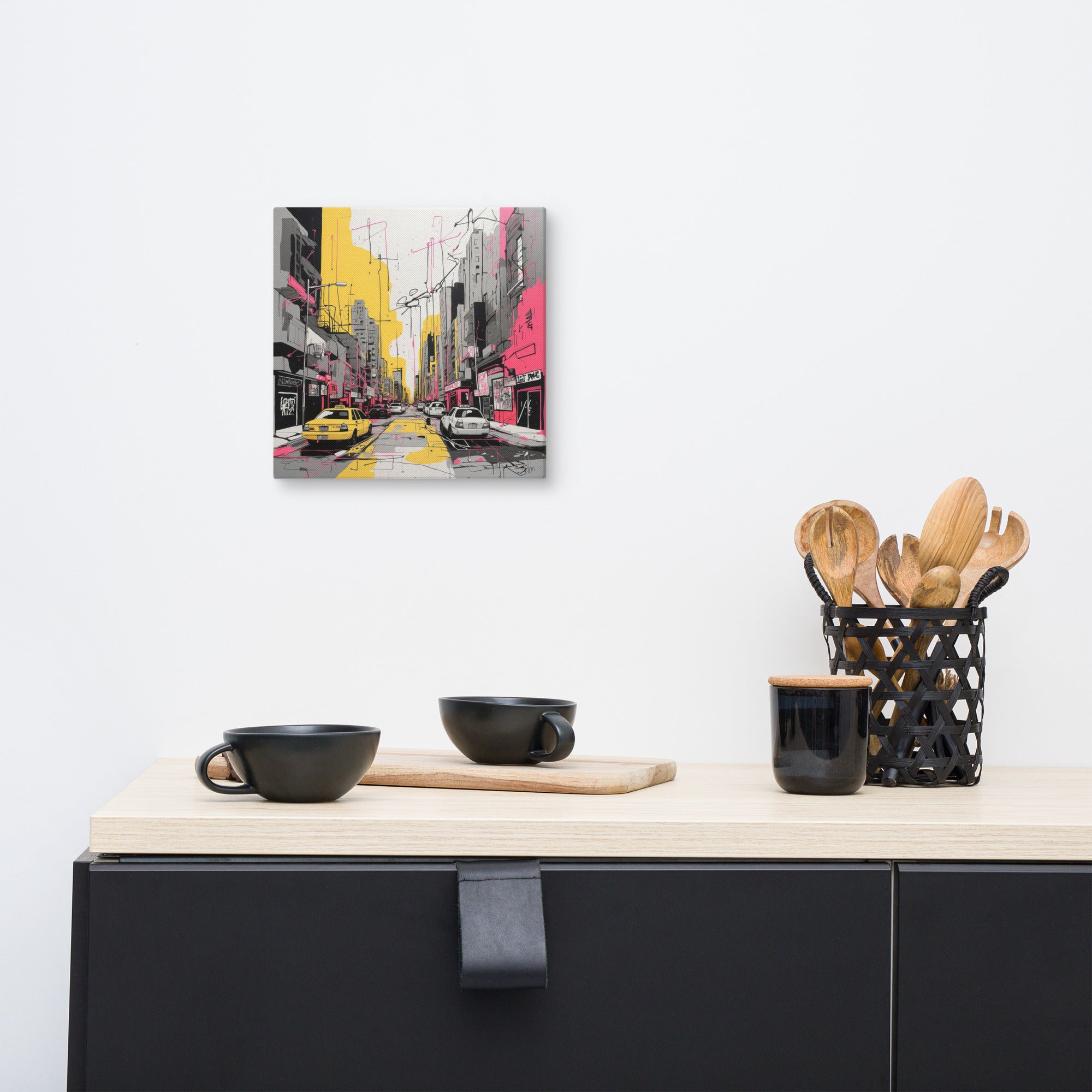 A bold urban artwork capturing a busy city street lined with taxis and skyscrapers, reimagined in striking neon pink, yellow, and gray tones. The energetic color palette and graphic pop-art style bring a dynamic, modern edge to any interior. Ideal for studios, offices, or contemporary living spaces.