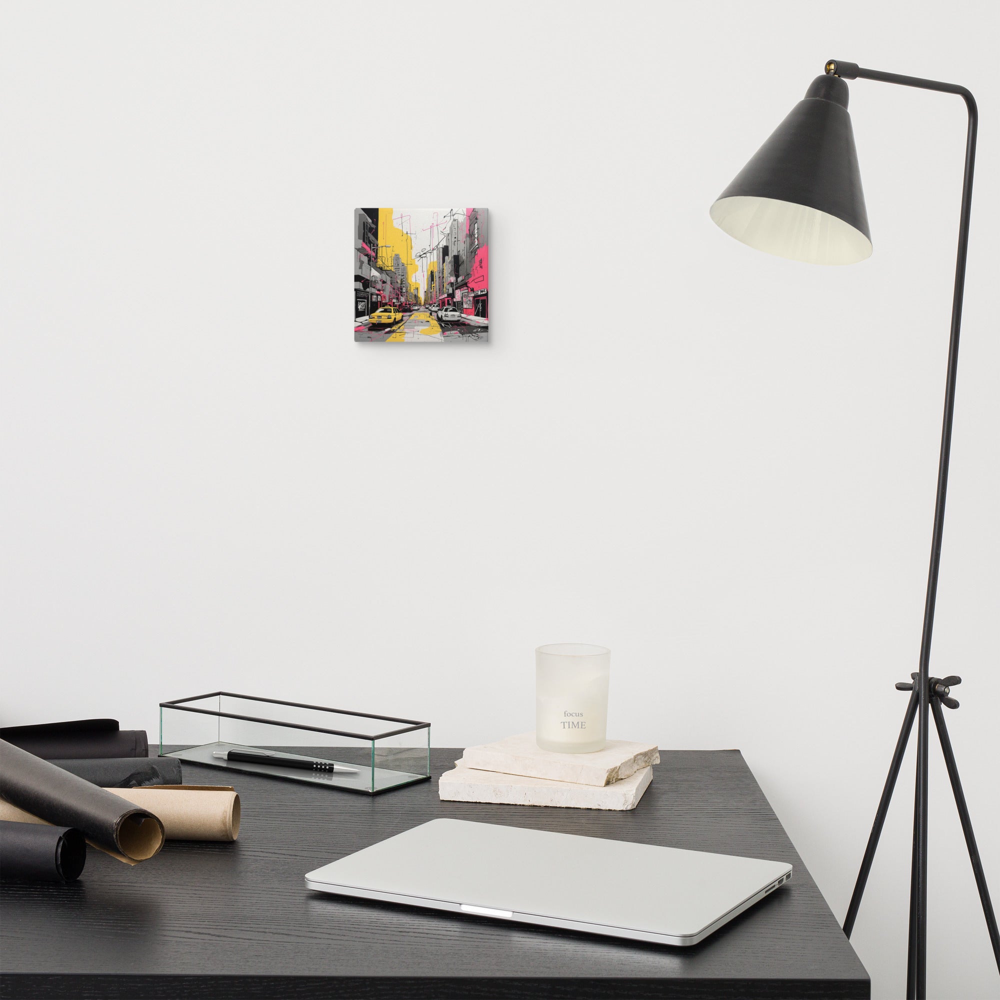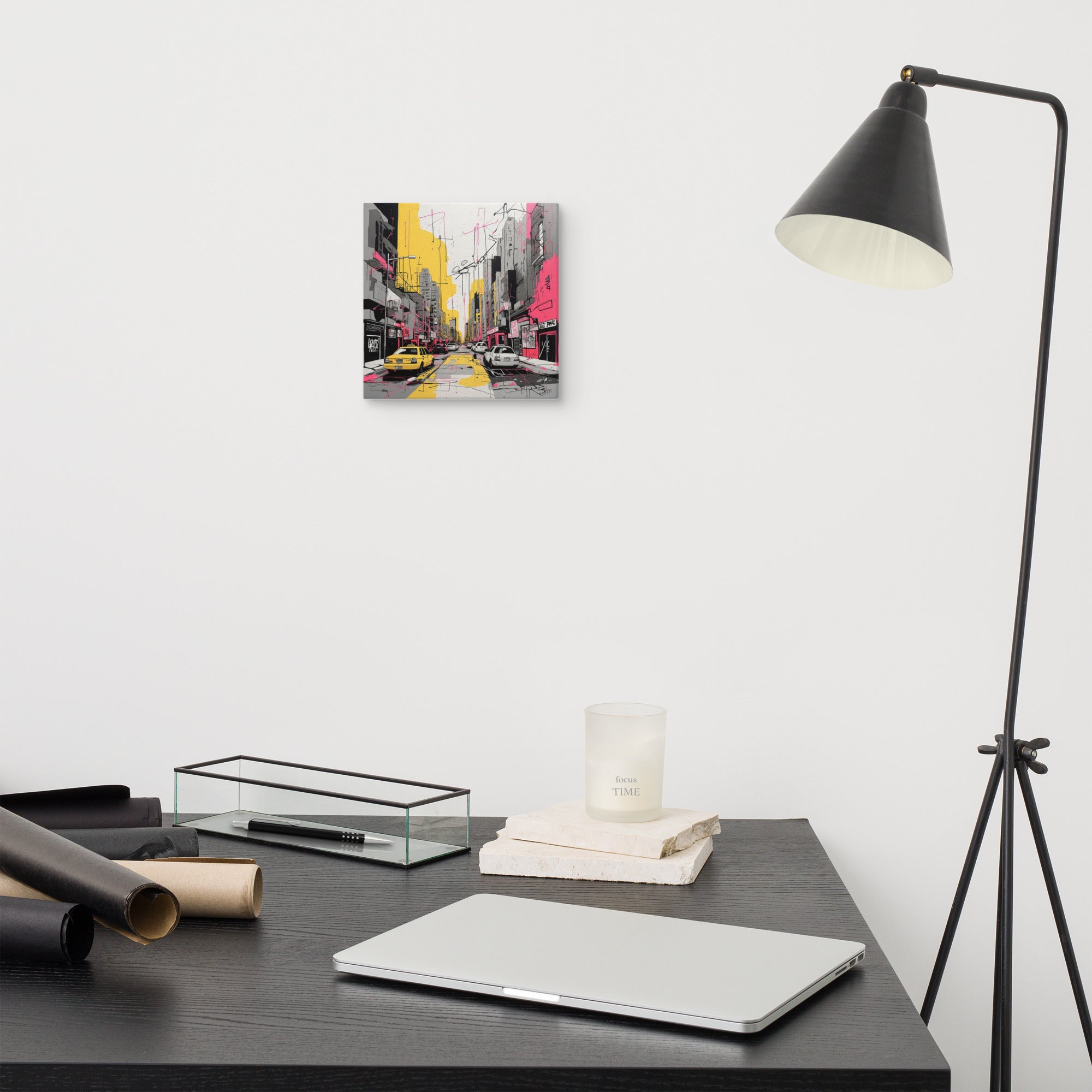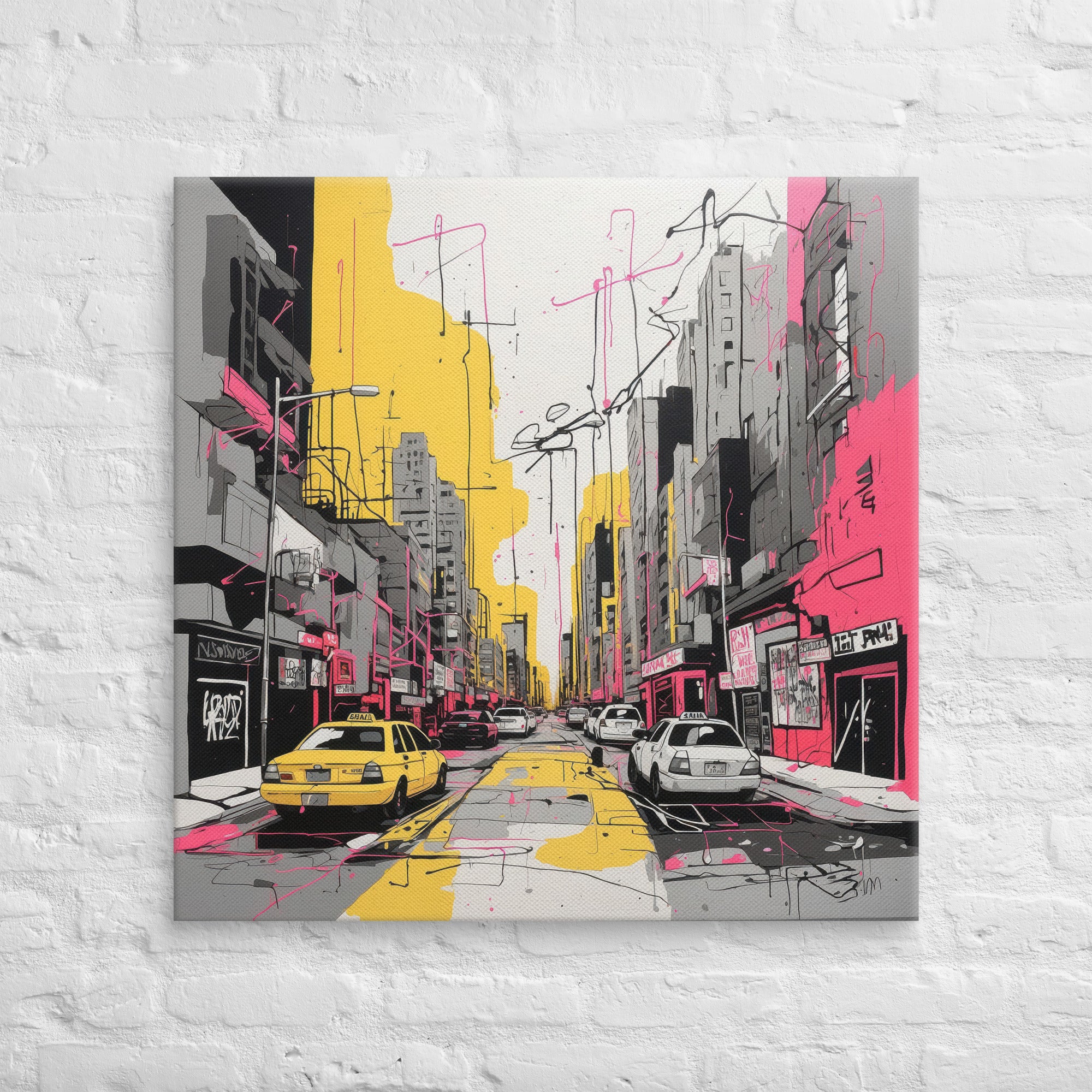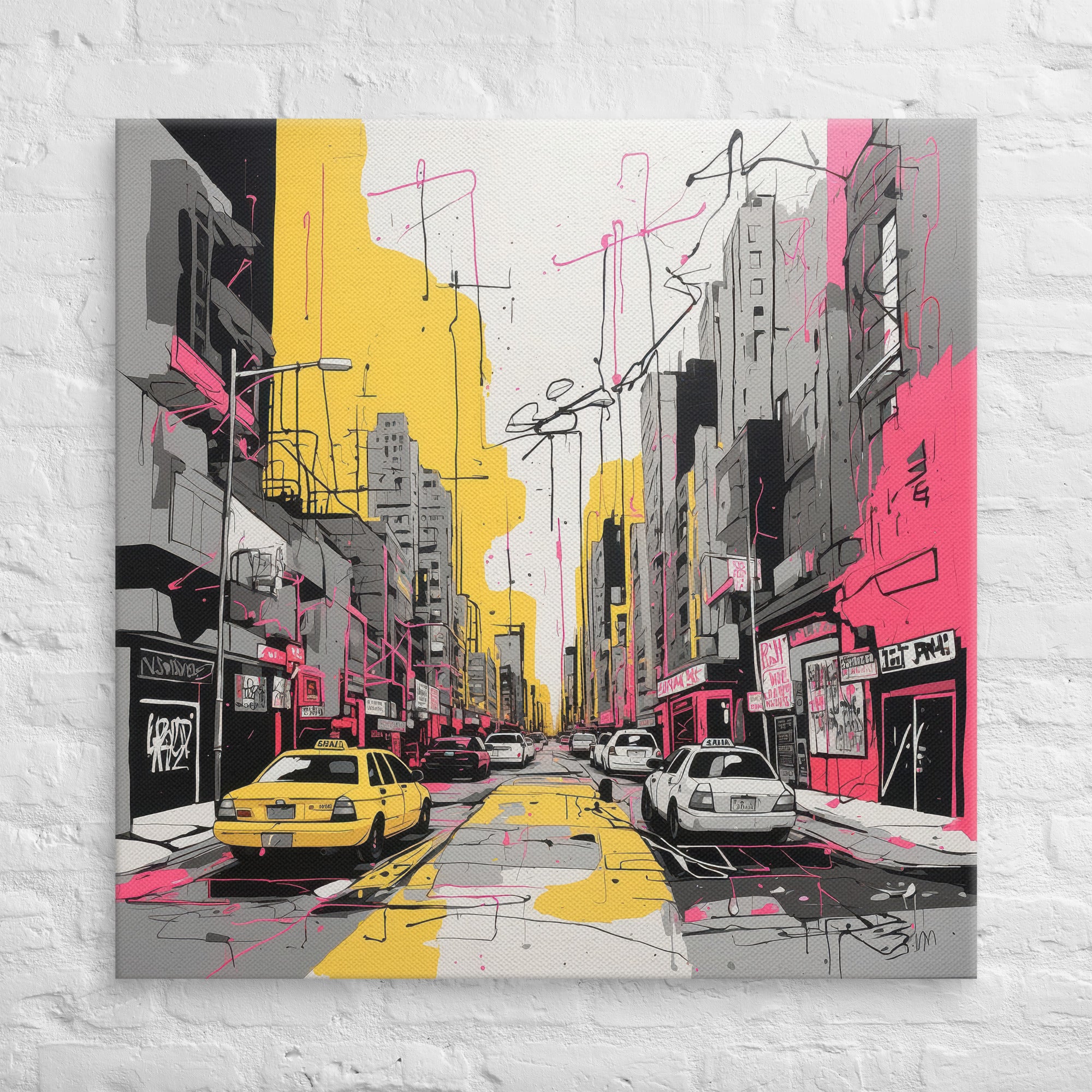 A bold urban artwork capturing a busy city street lined with taxis and skyscrapers, reimagined in striking neon pink, yellow, and gray tones. The energetic color palette and graphic pop-art style bring a dynamic, modern edge to any interior. Ideal for studios, offices, or contemporary living spaces.