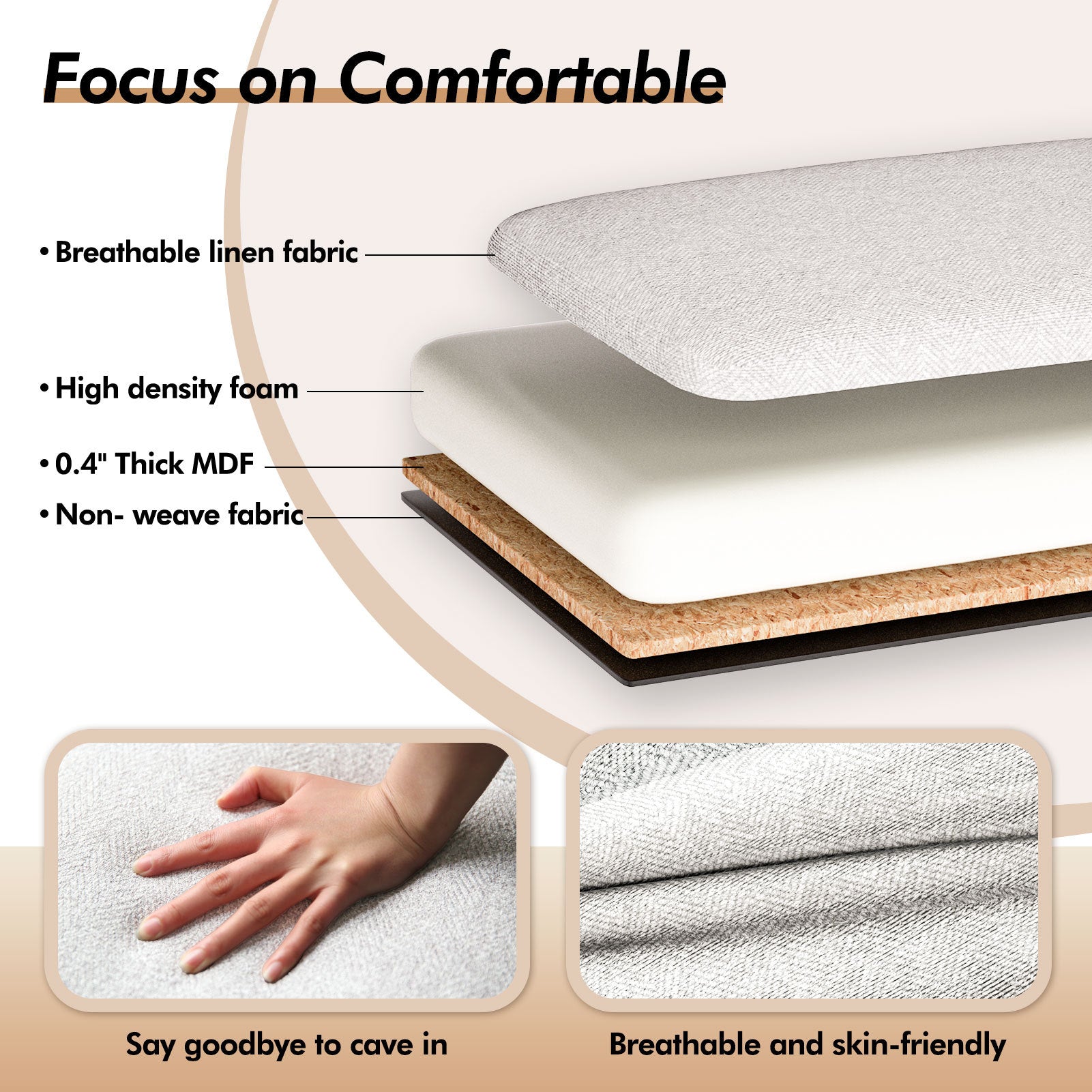 | Materials | Breathable linen fabric, high-density foam, MDF frame, non-woven lining |