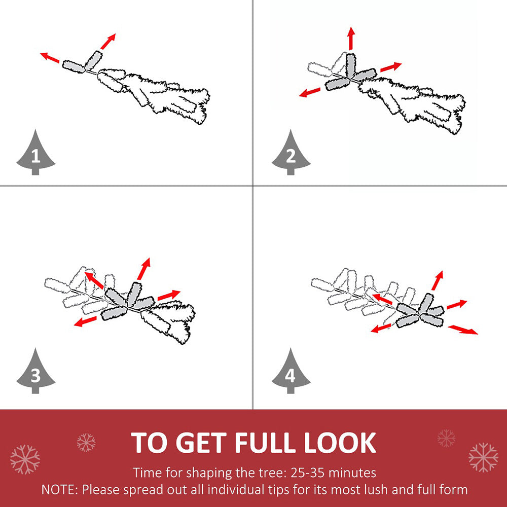 Unpack the tree on a soft surface. Allow branches to open automatically, then gently spread and shape each individual tip for the fullest, most natural look — plan on 25–35 minutes for best results. Attach the included metal stand securely and place the tree on a flat, level surface. This model is unlit — add your own lights and ornaments. Keep away from open flames and heat sources; while branches are flame-retardant, they are not fireproof.