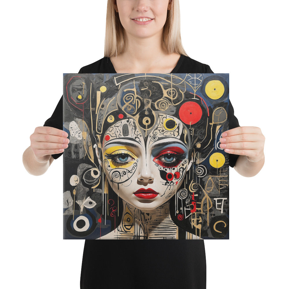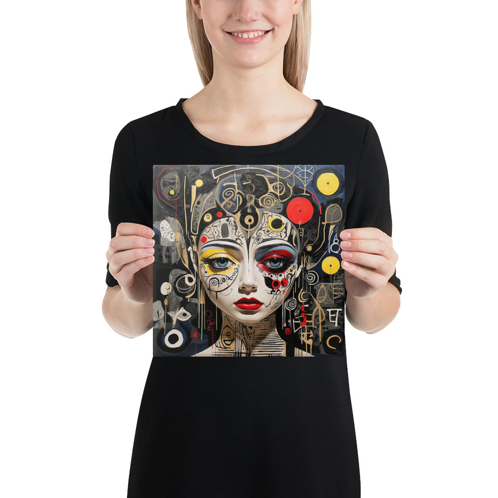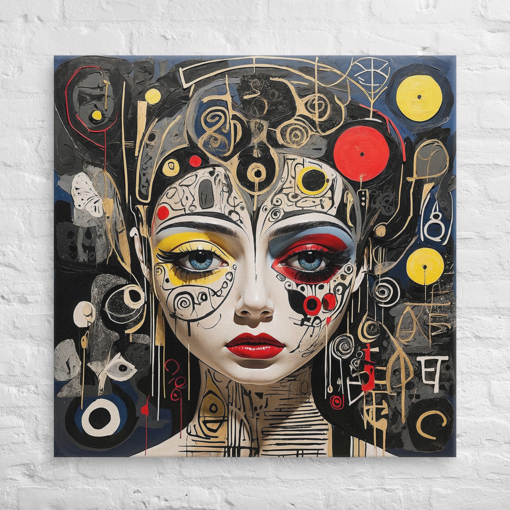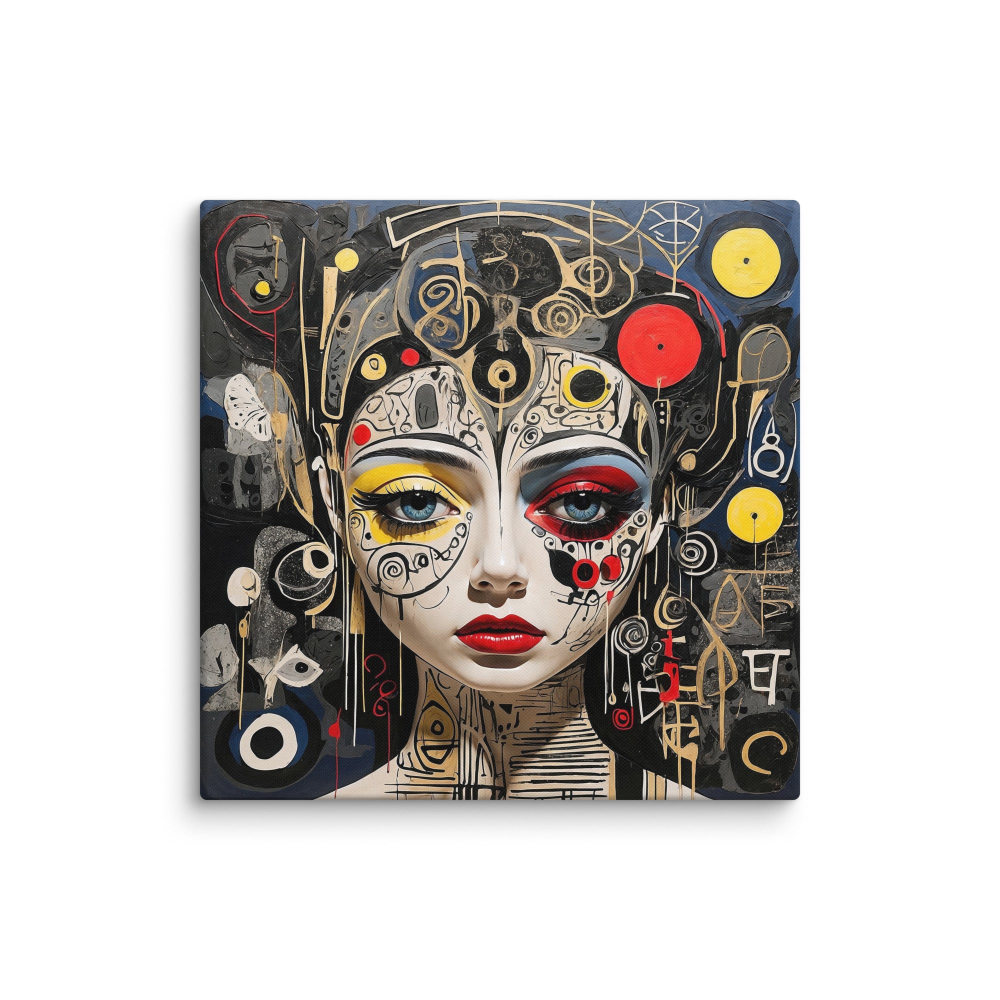 This striking portrait blends surreal beauty with bold abstraction, featuring vivid splashes of red, yellow, and blue surrounding a captivating gaze. The intricate geometric motifs and layered textures evoke emotion and creativity, ideal for modern and eclectic interiors.