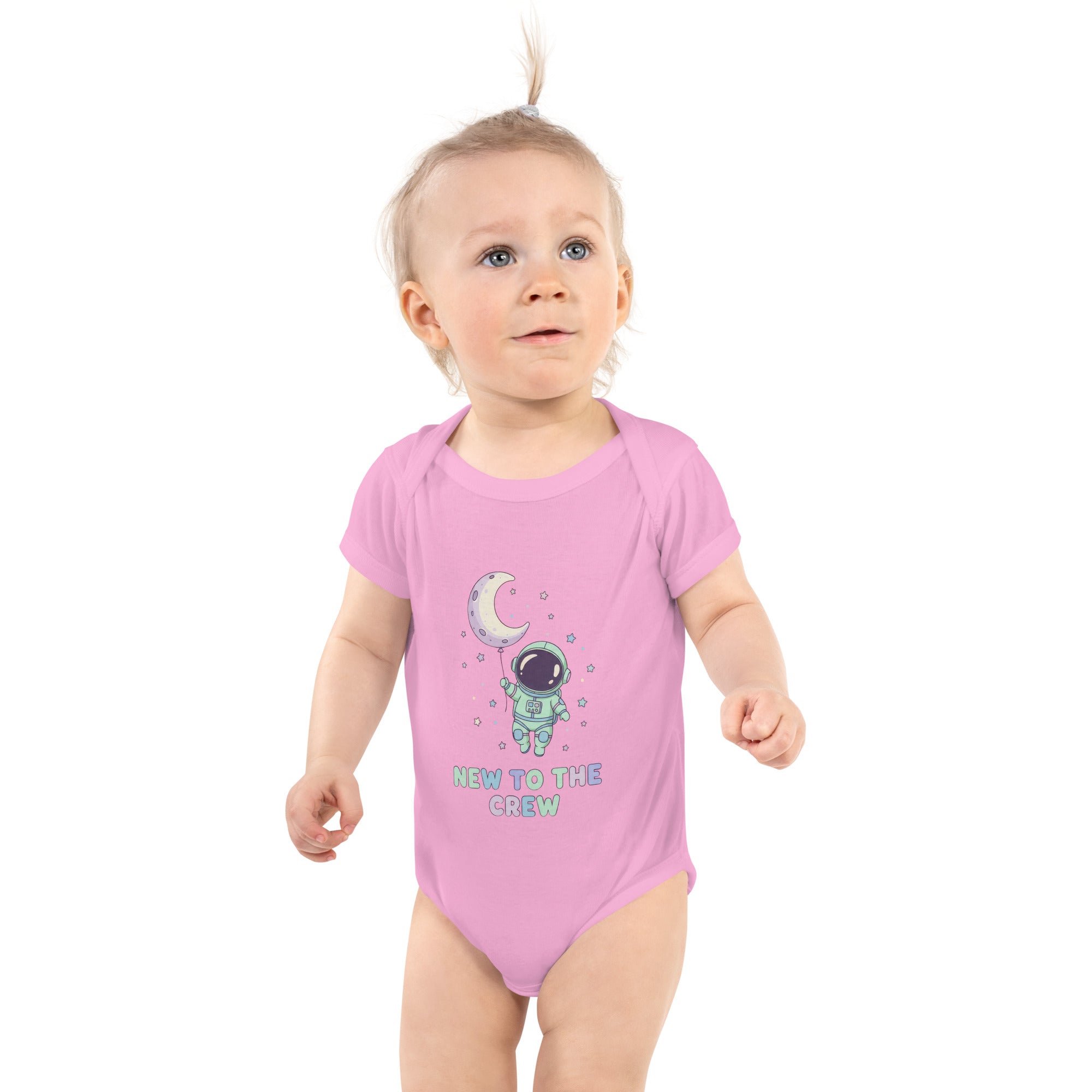 Celebrate a cosmic new arrival with this charming bodysuit featuring a cute astronaut gently floating, holding a crescent moon balloon amidst a scattering of stars. The artwork boasts a delightful pastel gradient color scheme, beautifully complementing the sweet message 'NEW TO THE CREW'. This comfortable bodysuit is perfect for welcoming a little one into the family or for any aspiring space explorer's everyday adventures, making it a delightful and cozy Baby Short Sleeve Bodysuit.