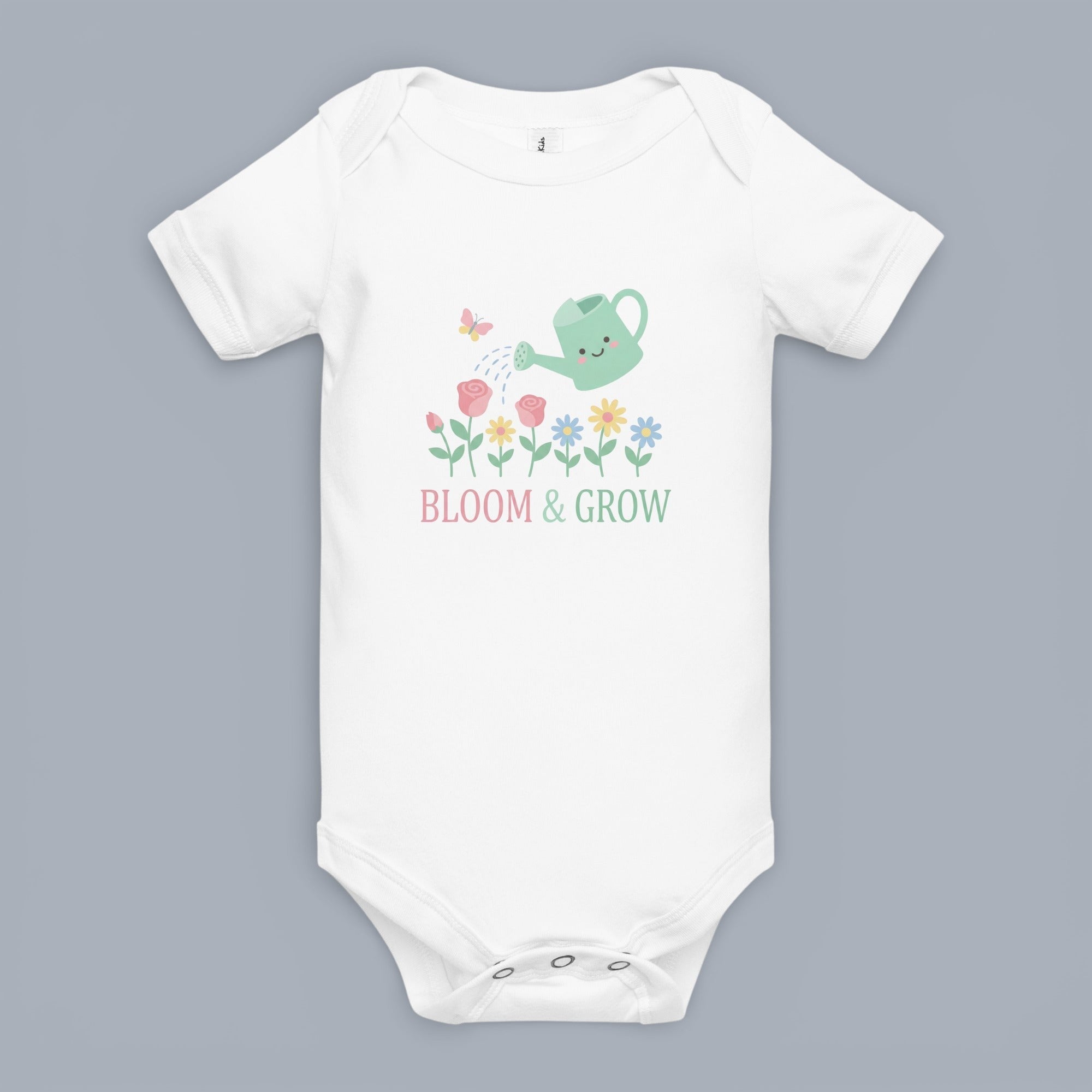 Celebrate the joy of nature with our adorable 'Bloom & Grow Garden' baby short sleeve one piece. This charming design features a friendly green watering can tending to sweet pink roses and a delightful row of yellow and blue flowers, accompanied by a little pink butterfly, all above the inspiring text 'BLOOM & GROW' in soft pastel pink and green. Crafted for comfort and everyday wear, this piece is perfect for little ones discovering the world around them, making it an ideal, comfortable Baby Short Sleeve One Piece for any occasion.