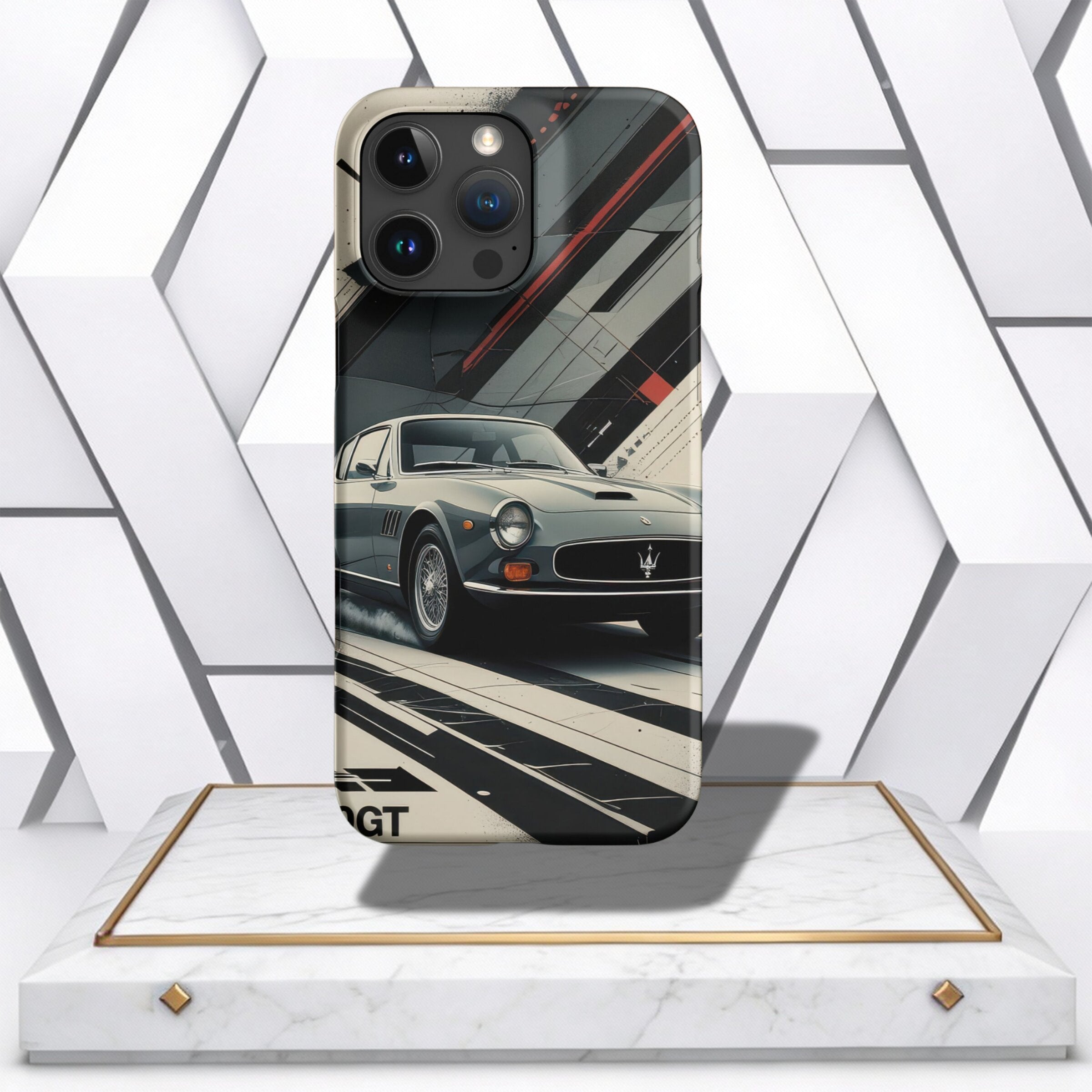 Elevate your smartphone with this striking snap case showcasing the iconic Maserati 3500GT. The dynamic artwork blends a light blue/grey hue with bold black lines and subtle red accents, embodying a perfect mix of classic automotive elegance and modern protection.