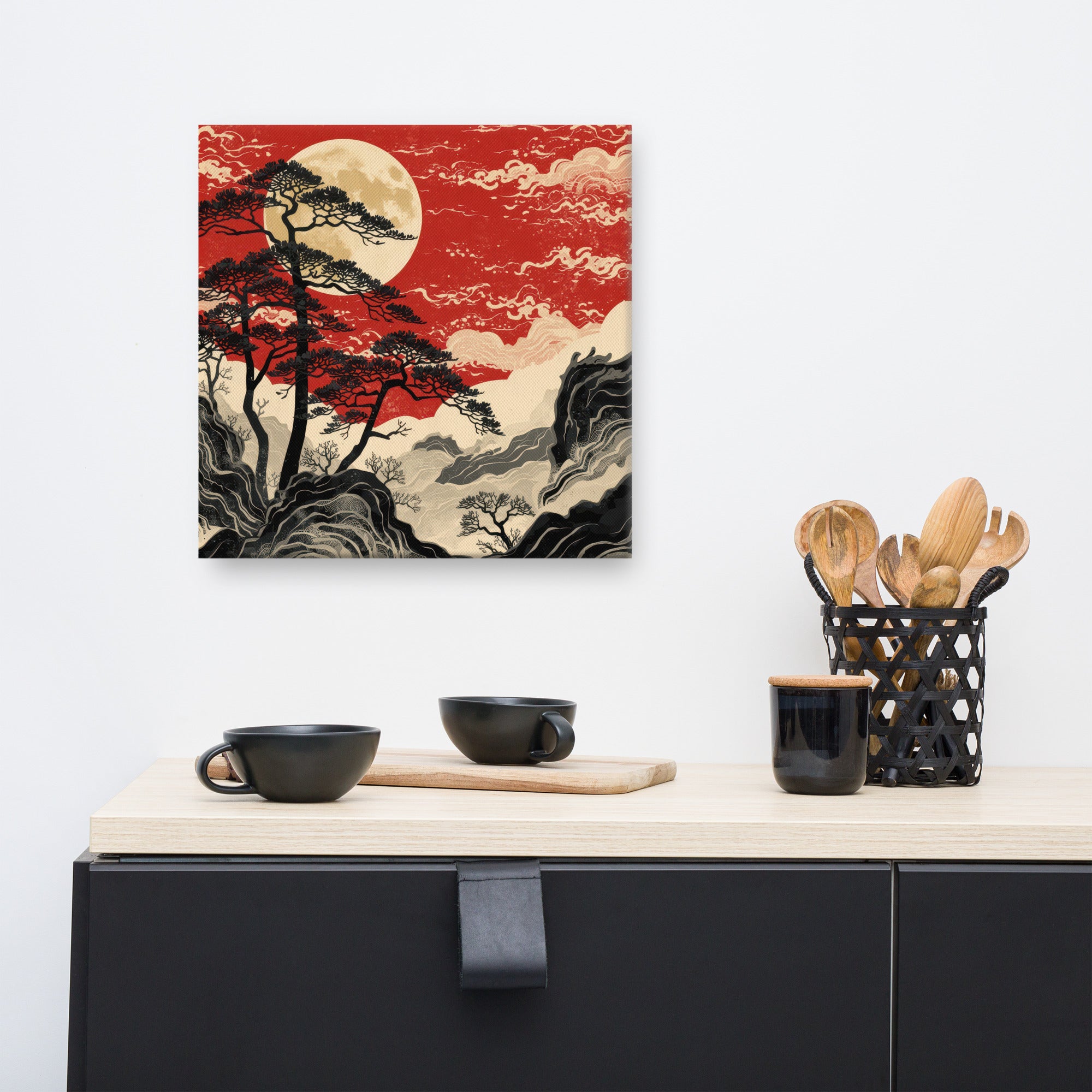 An evocative Japanese-style artwork depicting dark pine trees and swirling mountains beneath a luminous full moon and crimson sky. The rich red and gold tones create a dramatic, poetic mood, symbolizing strength and serenity. Perfect for statement walls, meditation rooms, or art-inspired interiors.