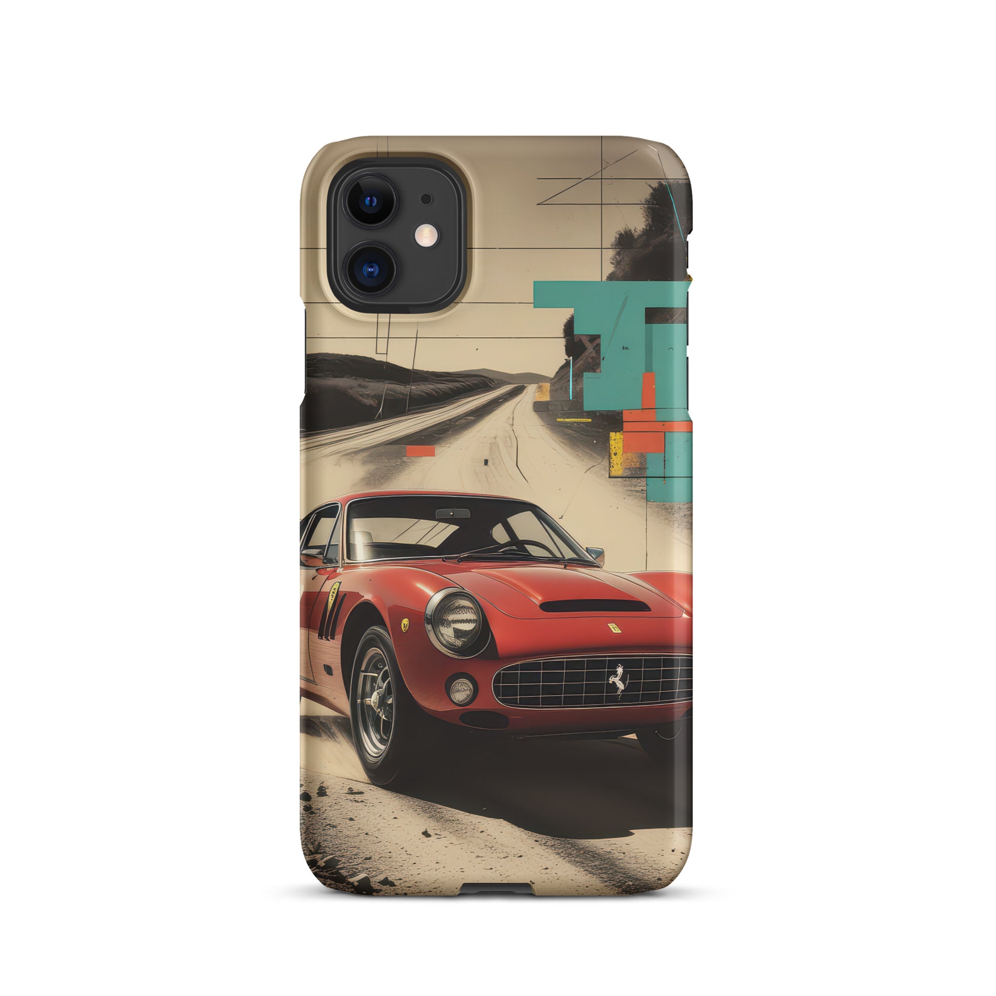 This snap case turns your phone into a slim rally poster, featuring a bright red sports coupe gliding along a dusty road under soft desert light and crisp geometric blocks. The mix of retro car styling and modern abstract shapes feels clean and artistic, perfect for everyday outfits or weekend drives. Lightweight and pocket-ready, it offers stylish scratch protection in a sleek Snap Case for iPhone®.