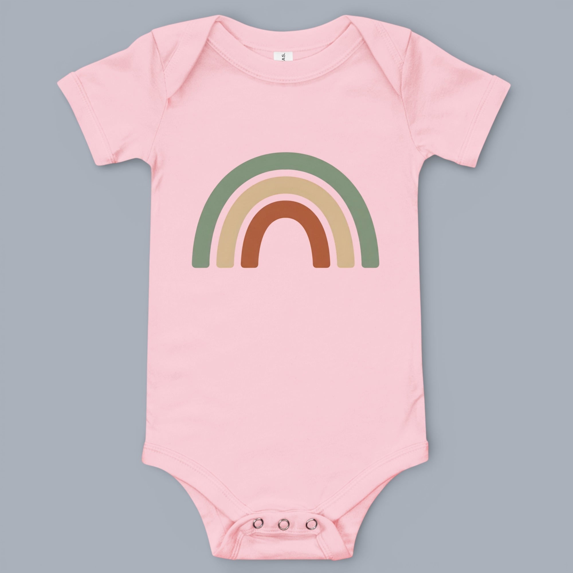 This charming baby one piece features a sweet, minimalist rainbow design printed across the chest. The artwork showcases three gentle arcs in earthy tones: a soft sage green, a warm beige, and a cozy burnt orange, creating a soothing and modern aesthetic. Crafted for comfort, this one piece is perfect for everyday wear, offering an easy-to-style option for your little one's wardrobe. It's a versatile and comfortable Baby Short Sleeve One Piece that's ideal for playdates, naps, or special outings.