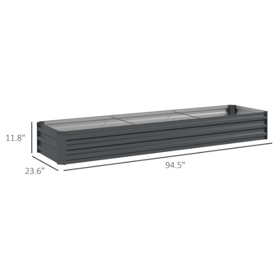 Durable, rust-resistant raised garden bed crafted from powder-coated galvanized steel — designed for easy assembly, direct soil contact, and secure planting. With an open bottom for natural drainage and reinforced support brackets, this 94.5" x 23.6" x 11.8" planter gives vegetables, herbs, and flowers a clean, elevated space to grow while protecting hands with safety edging and rounded corners.