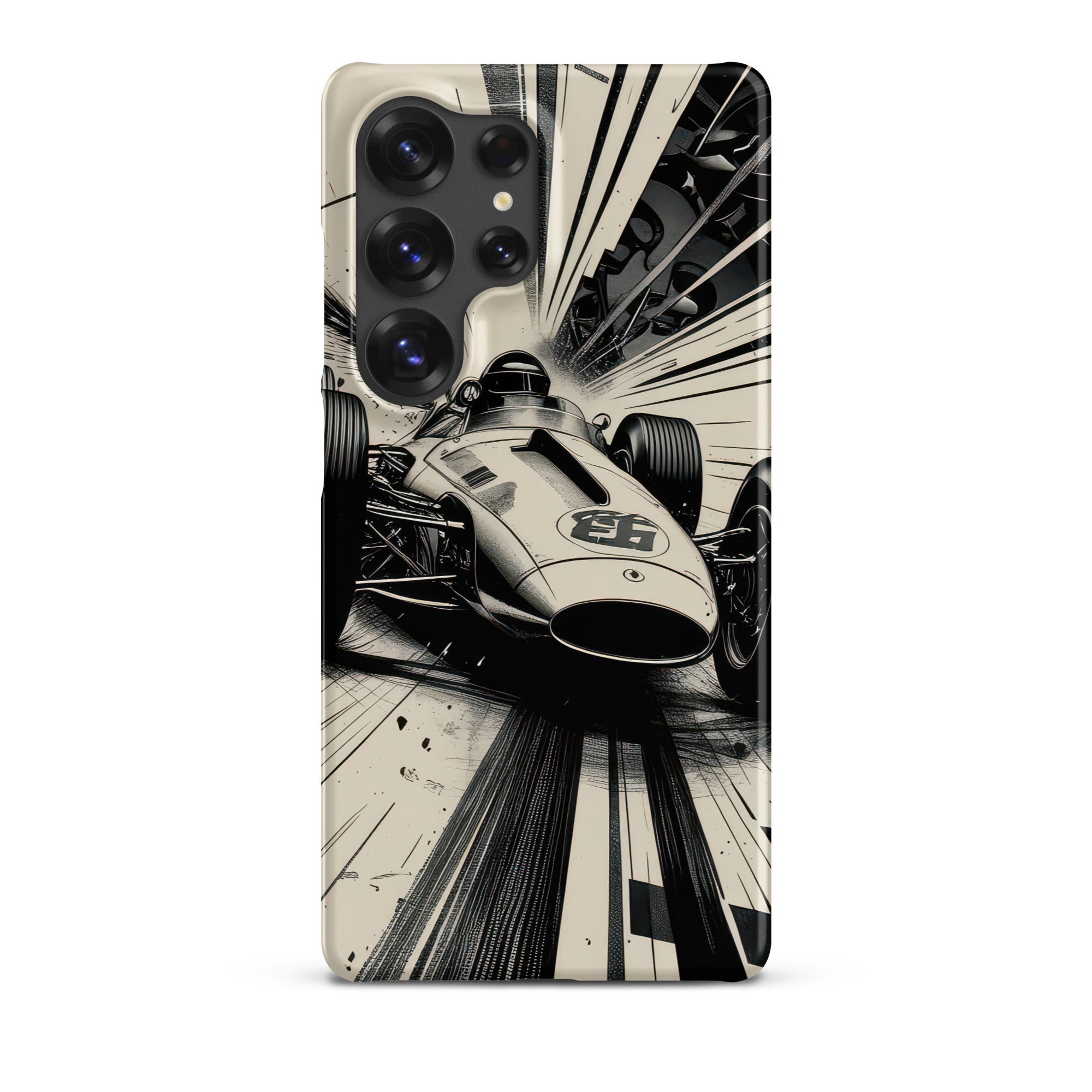 A vintage-style single-seater rockets toward the viewer, tires and speed lines pulling you straight onto the grid in sharp black and ivory tones. The sleek snap-on profile keeps your Samsung phone feeling light while turning it into a miniature racing poster. Ideal for fans of fast machines and minimalist graphics, it fits easily in pockets and small bags. Enjoy streamlined everyday coverage with this snap case for Samsung®.