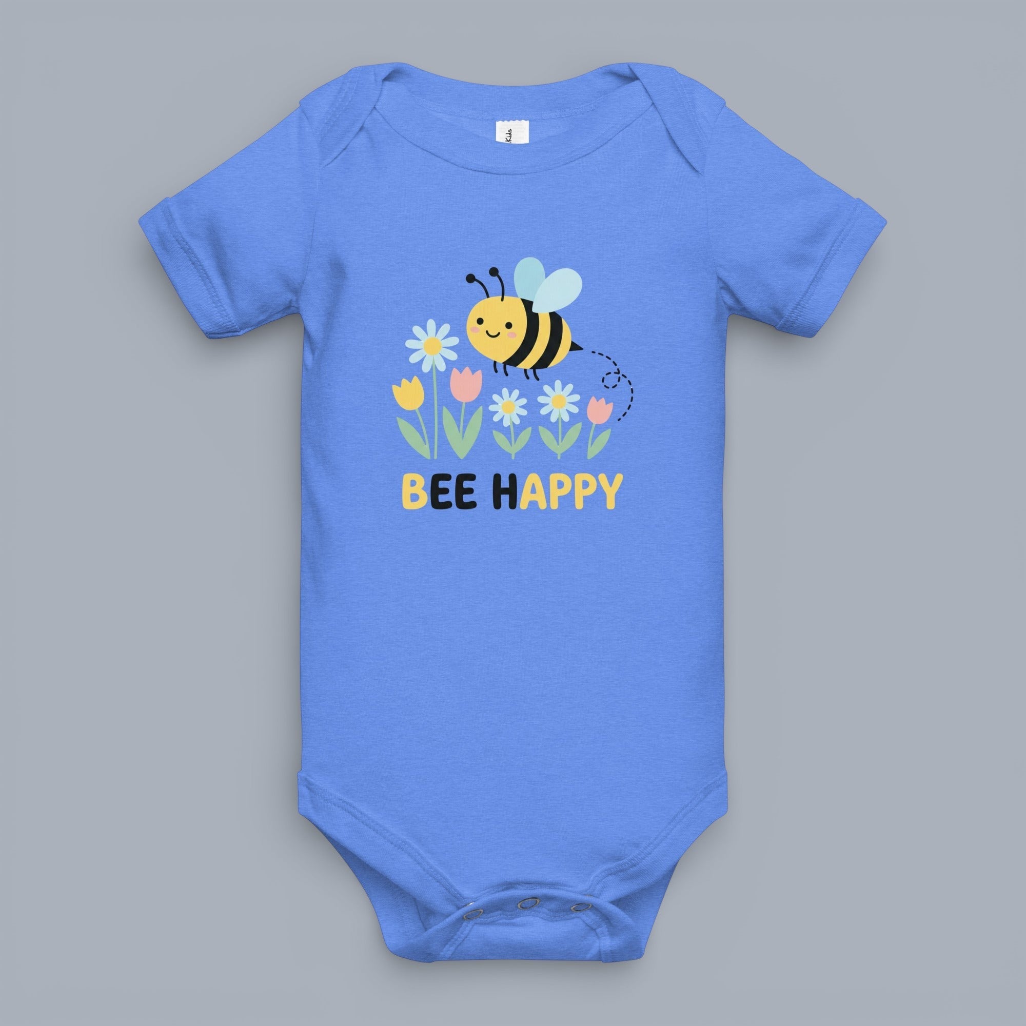 Bring a smile to your little one's face with this charming baby one piece, featuring a delightful cartoon bumblebee soaring over a vibrant garden. The uplifting message 'BEE HAPPY' is prominently displayed, making it a joyful addition to any child's wardrobe.