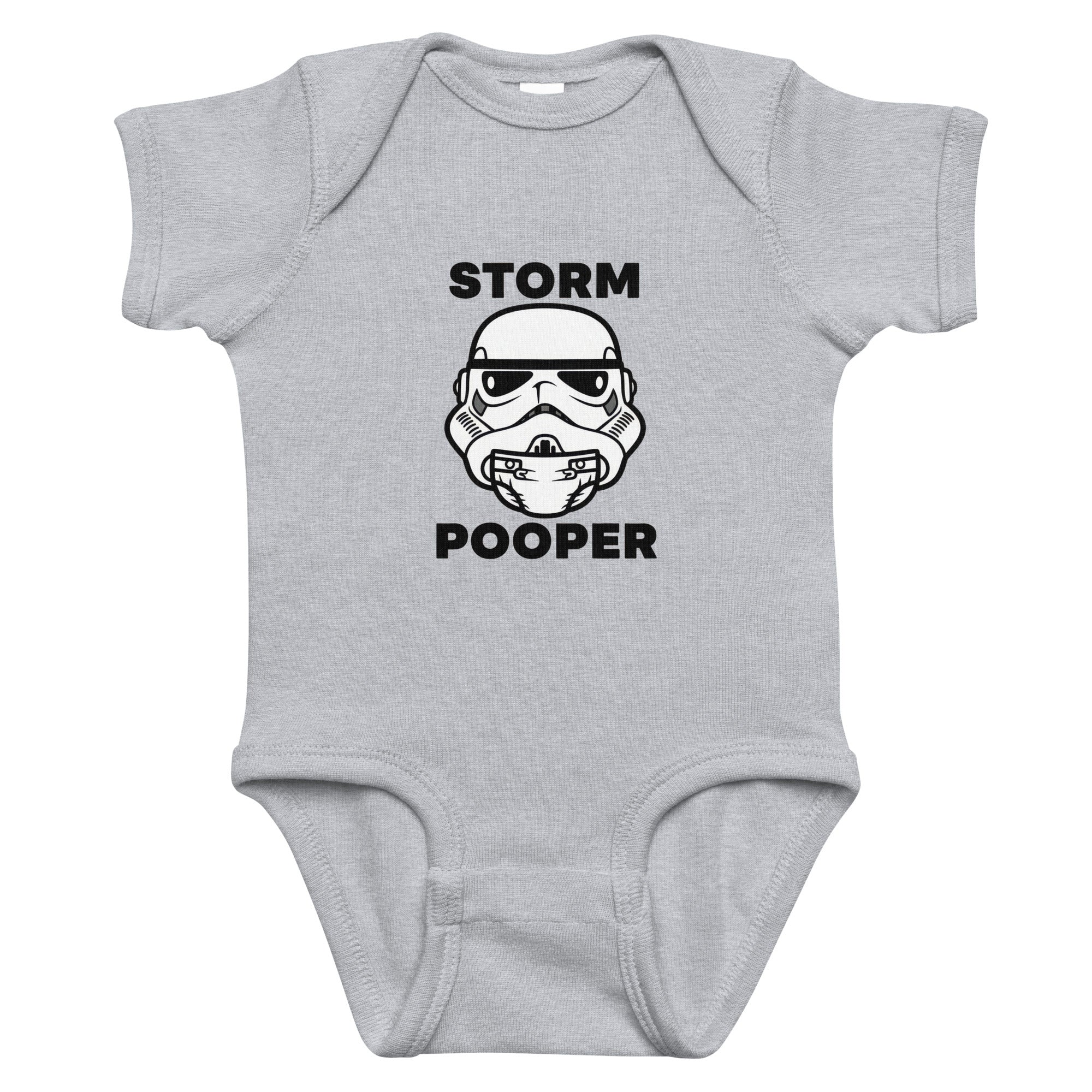 This adorable baby bodysuit features a clever, humorous graphic perfect for fans of galactic sagas. It displays a stylized black and white illustration of a recognizable sci-fi helmet, humorously paired with a cartoon baby diaper, and the bold text 'STORM POOPER'. This playful design offers a comfortable and charming outfit for your little one, ideal for daily adventures or making a fun statement. Crafted for softness and ease of movement, this Baby Short Sleeve Bodysuit is perfect for sensitive skin.