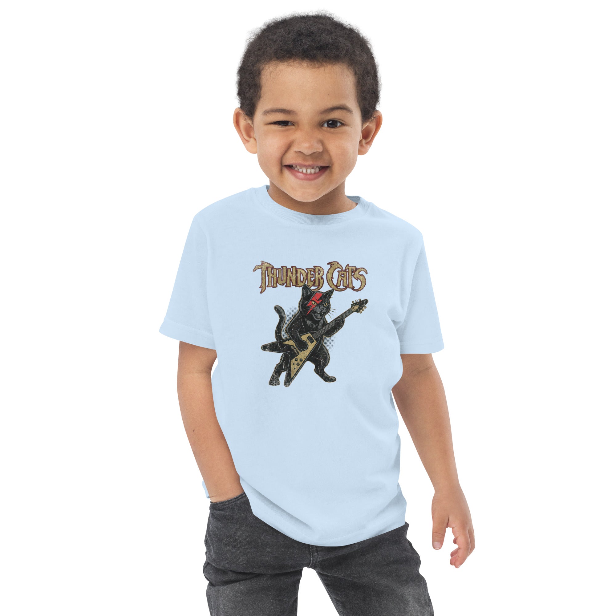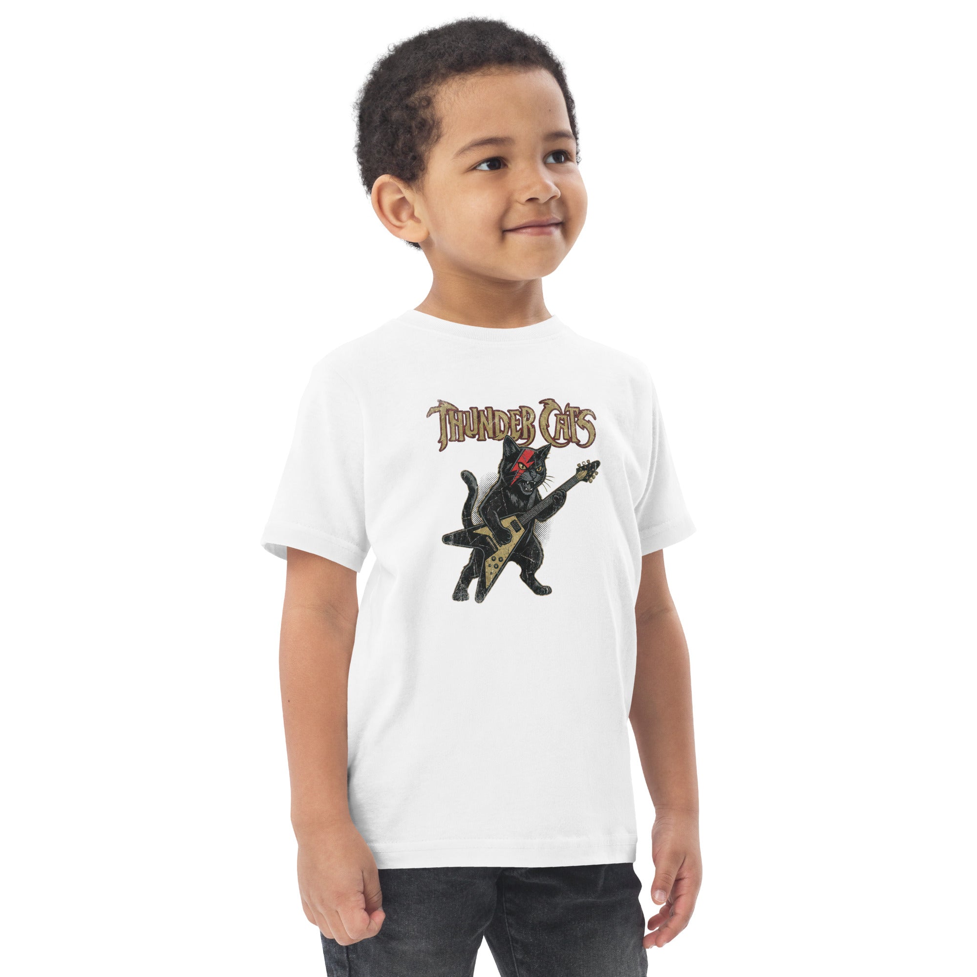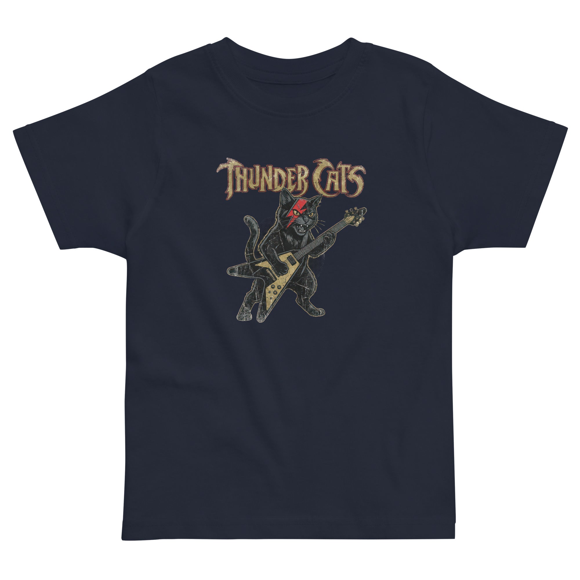 This t-shirt features a cool black cat playing a gold V-shaped electric guitar, complete with a striking red lightning bolt across its eye, creating an undeniable rock-and-roll vibe. Above the electrifying feline, the text 'THUNDER CATS' is displayed in a distressed, gothic-inspired font, adding to its edgy appeal. This design combines the iconic imagery of a thunderous band with a playful cat motif. Your little one will love the soft, durable feel that's perfect for all their daily adventures, ensuring they stay comfortable in this awesome Toddler Jersey T-Shirt.
