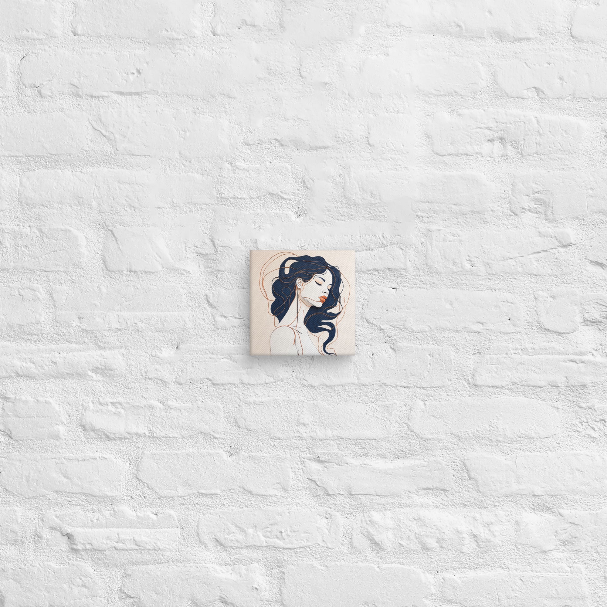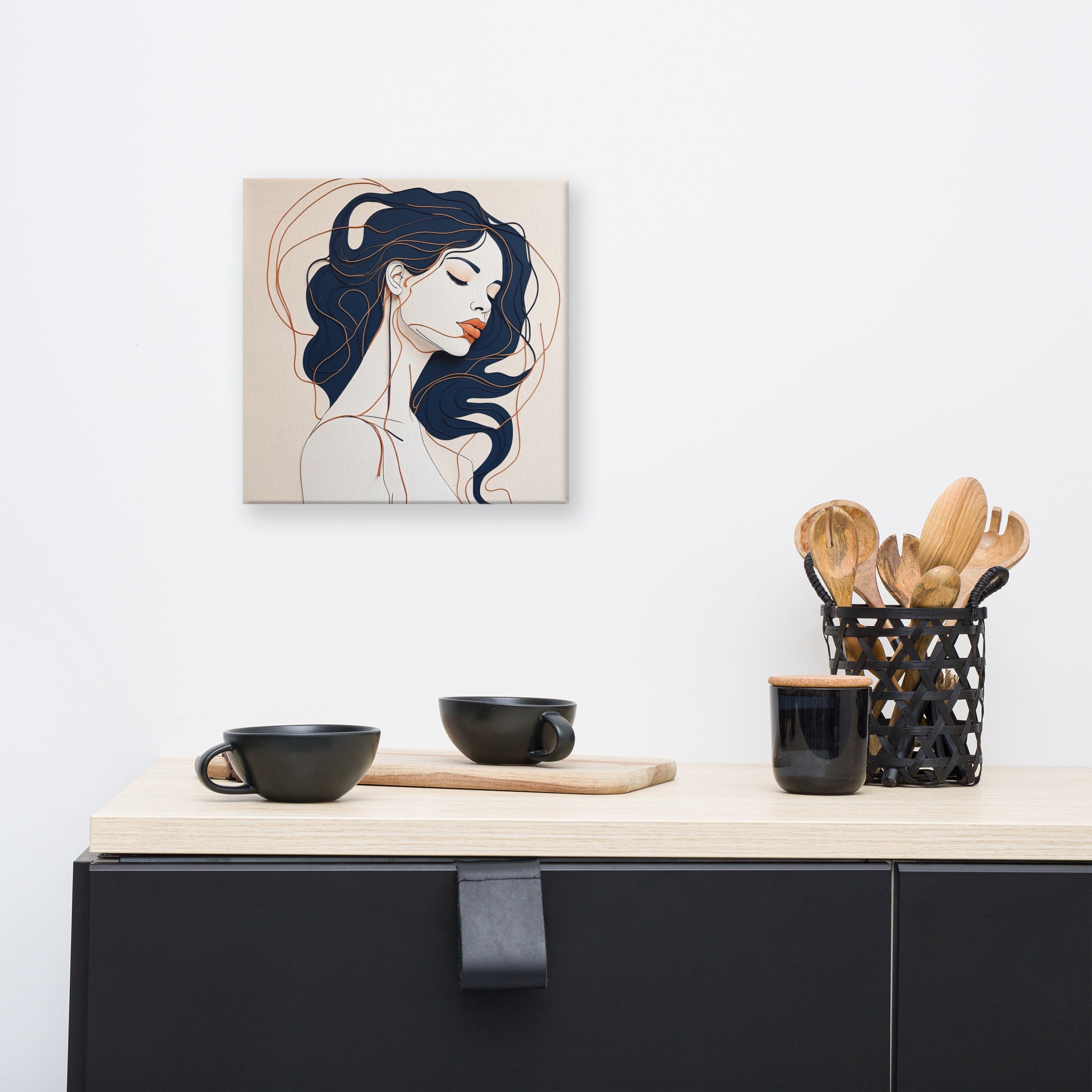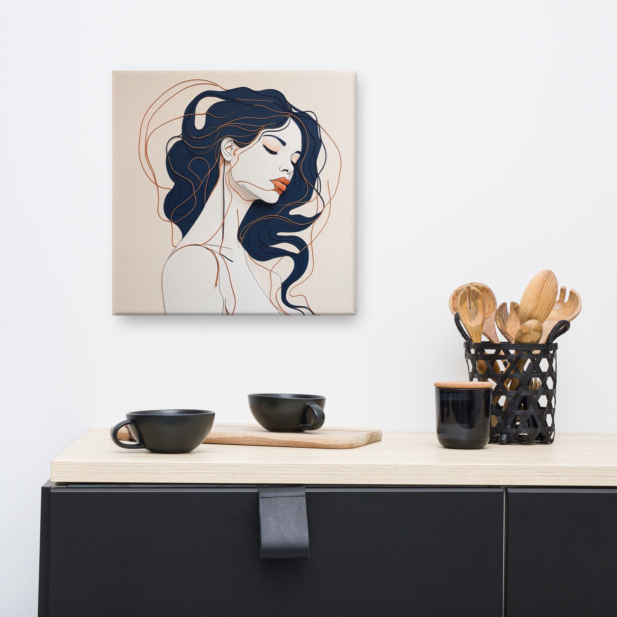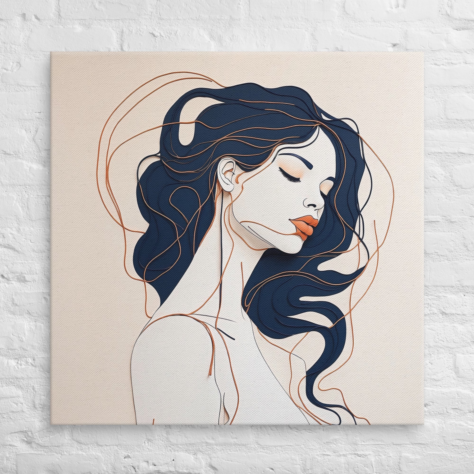 This elegant minimalist artwork features a peaceful female portrait drawn with fluid navy and copper lines. Its clean design and warm tones create a sense of balance and calm, making it perfect for contemporary, boho, or Scandinavian interiors.