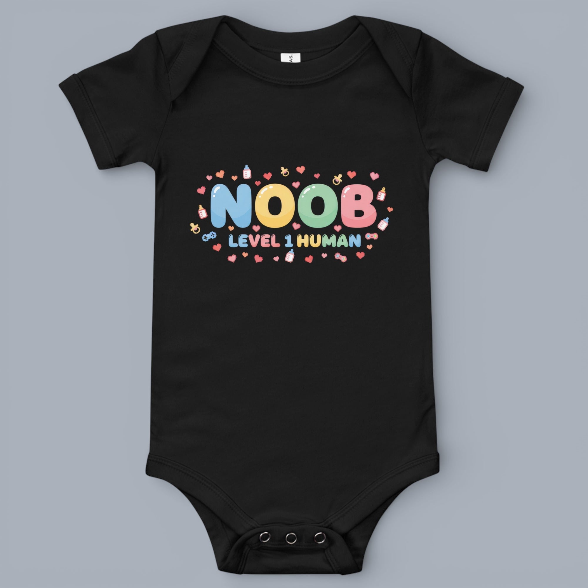 Playful 'NOOB' graphic in colorful text with 'LEVEL 1 HUMAN' underneath