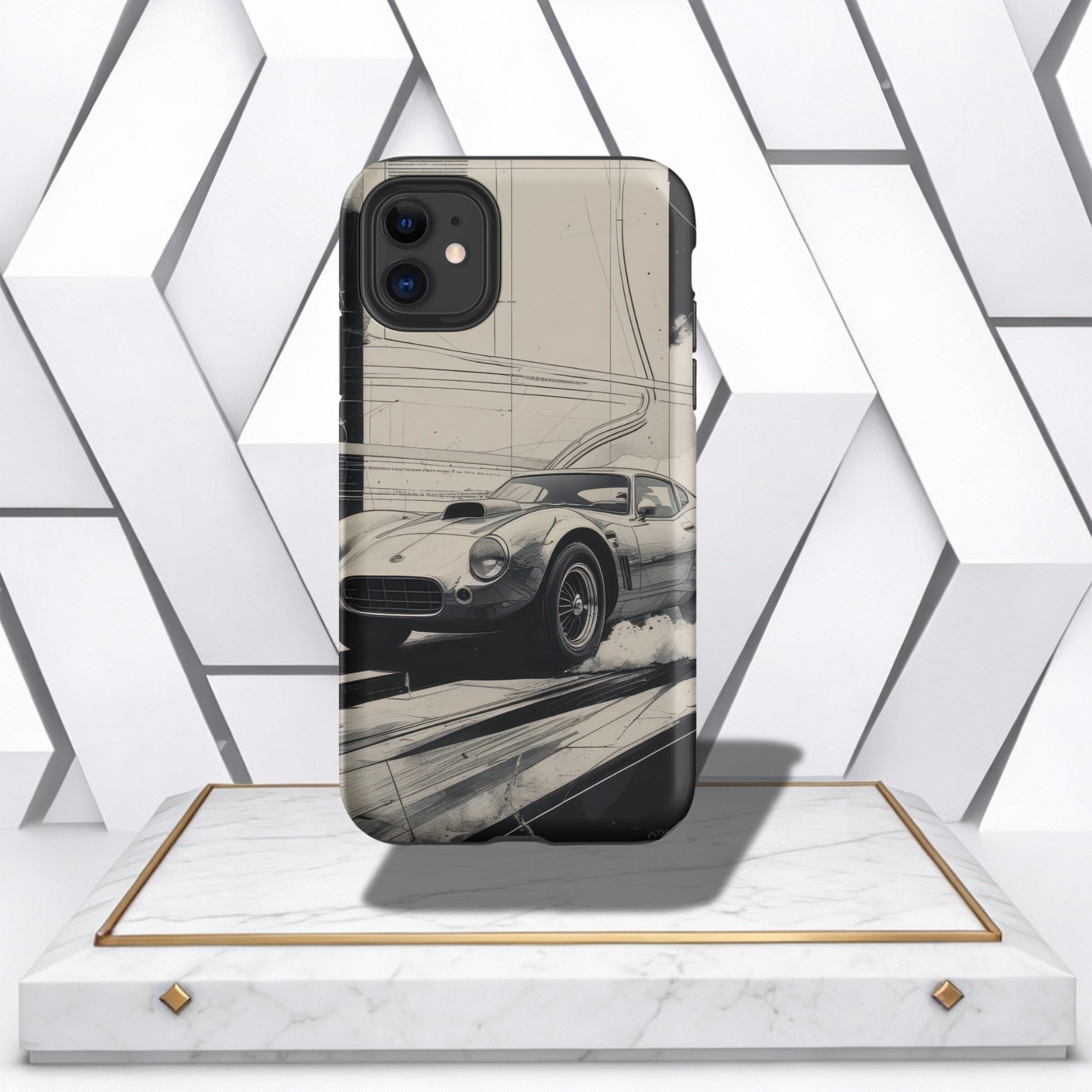 Coocosh phone case featuring a classic car design, printed on durable plastic, highlighting a vintage sports car in motion with a blueprint background in black and white. A stylish way to protect your phone. The case offers a snug fit and a slim profile f