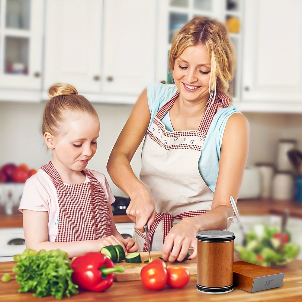 Restore kitchen knives to razor-sharp performance with this compact roller/tumbler sharpener. Featuring a durable diamond grinding surface and an ultra-fine ceramic honing disc plus an adjustable dual-grind system, it quickly reshapes and polishes blades while a built-in N52 neodymium magnetic guide holds each knife at the optimal angle. The wood-tone finish adds a touch of elegance to any kitchen — a practical, long-lasting gift for home cooks and pros alike.