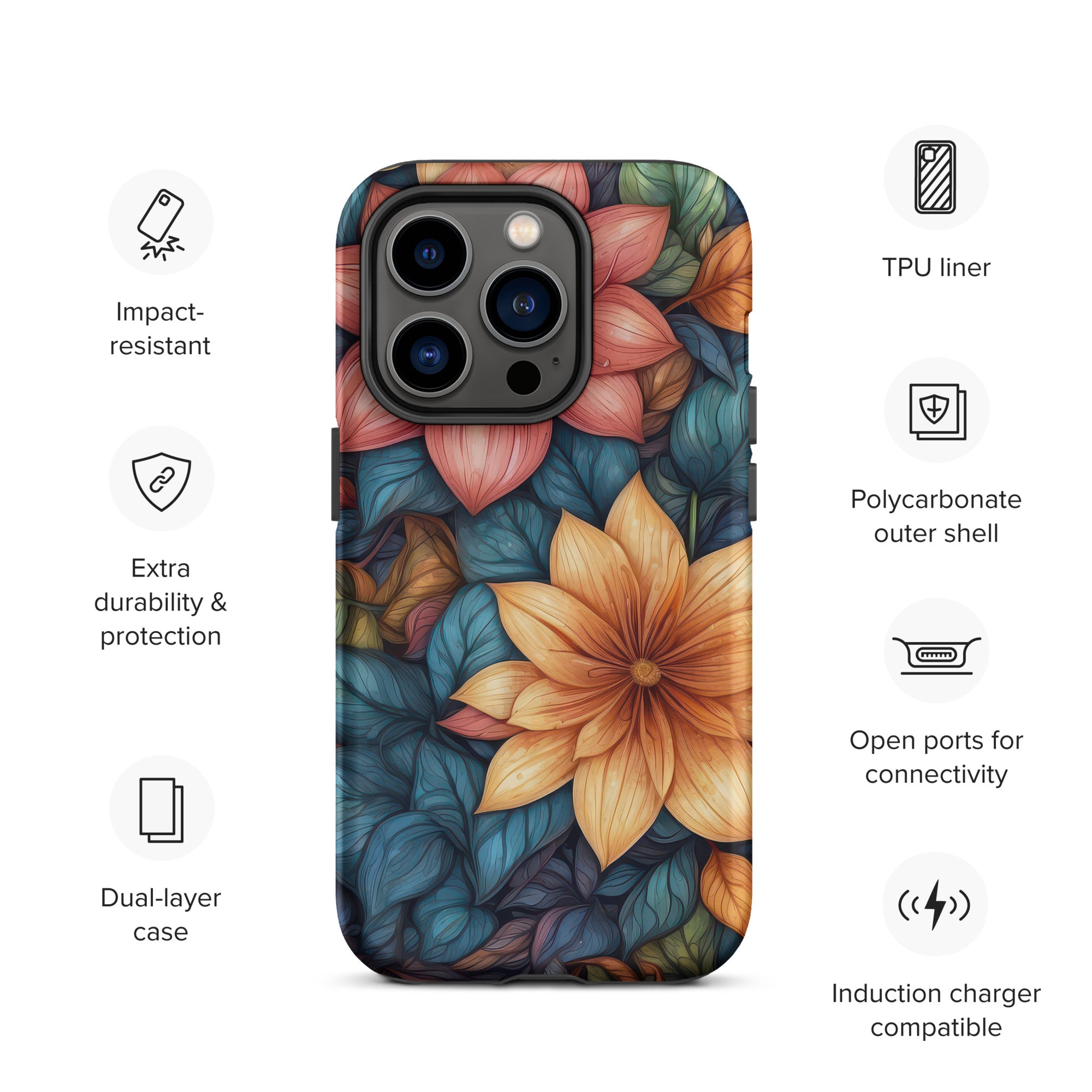 This stunning case features a dense, layered tapestry of stylized flowers in warm terracotta and burnt orange, beautifully contrasted by deep teal and muted green leaves. The rich, earthy palette evokes an elegant autumnal mood, perfect for those who appreciate sophisticated botanical designs. Its dual-layer construction offers a reassuringly solid feel, making it an ideal choice for anyone seeking both style and superior protection. Enjoy dependable dual-layer defense with this Tough Case for iPhone®.