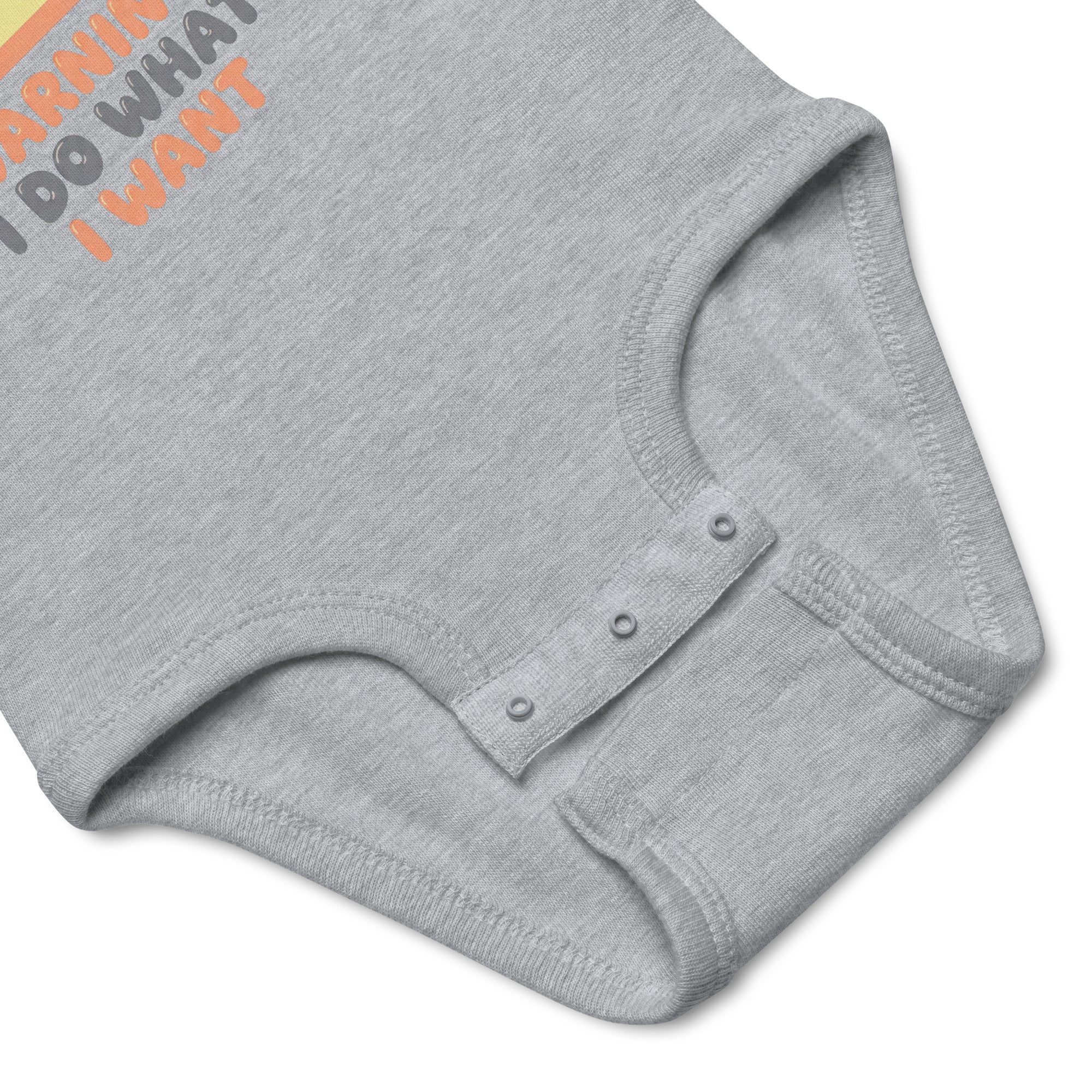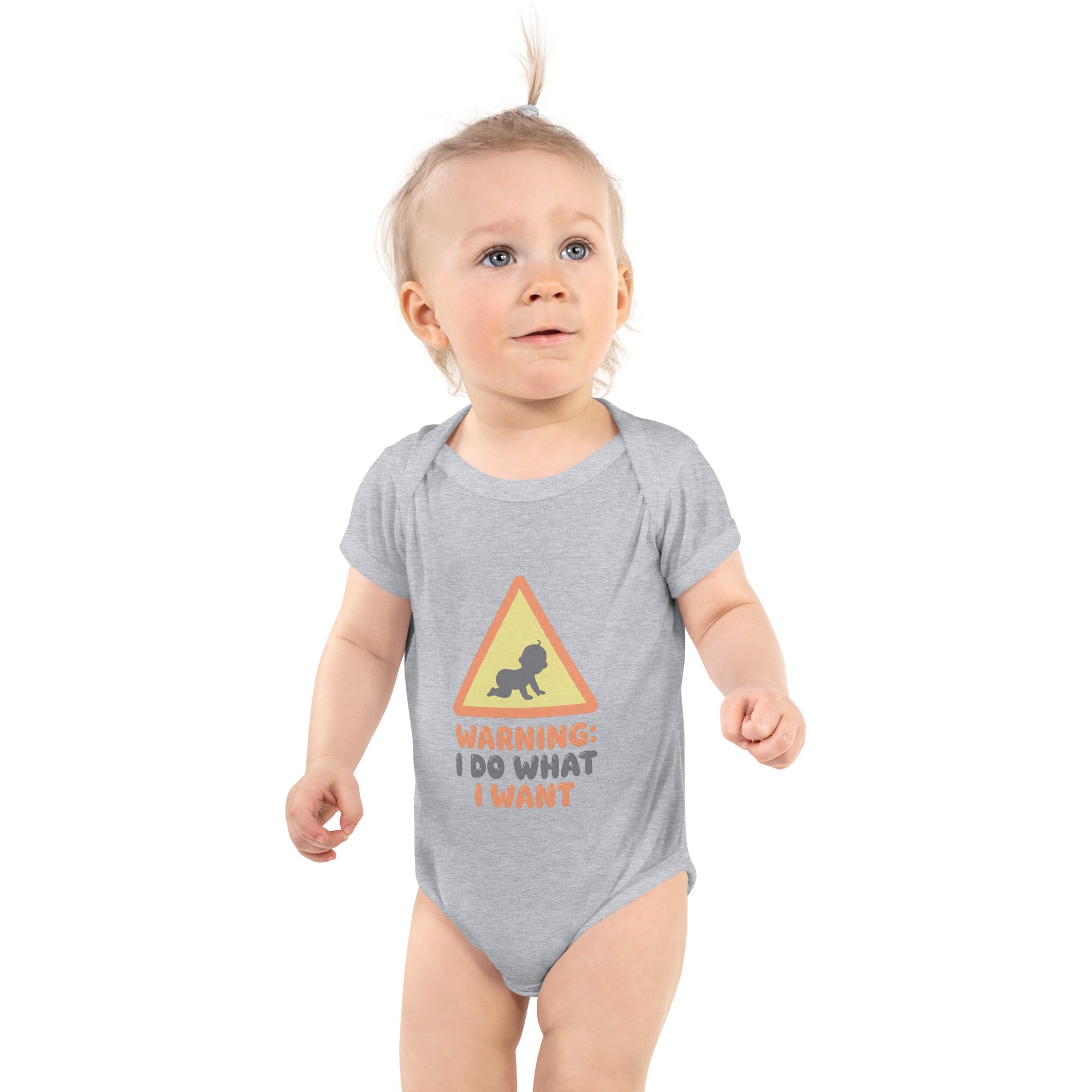 This playful baby bodysuit features an attention-grabbing warning sign graphic, showcasing a crawling baby silhouette within a vibrant yellow triangle bordered in orange. Below the striking visual, the bold text declares 'WARNING: I DO WHAT I WANT' in contrasting orange and dark gray, perfectly capturing the mischievous spirit of little ones. It's ideal for parents with a fun sense of humor and makes a memorable statement. Crafted for ultimate comfort and durability, this Baby Short Sleeve Bodysuit is ideal for your child's everyday adventures.