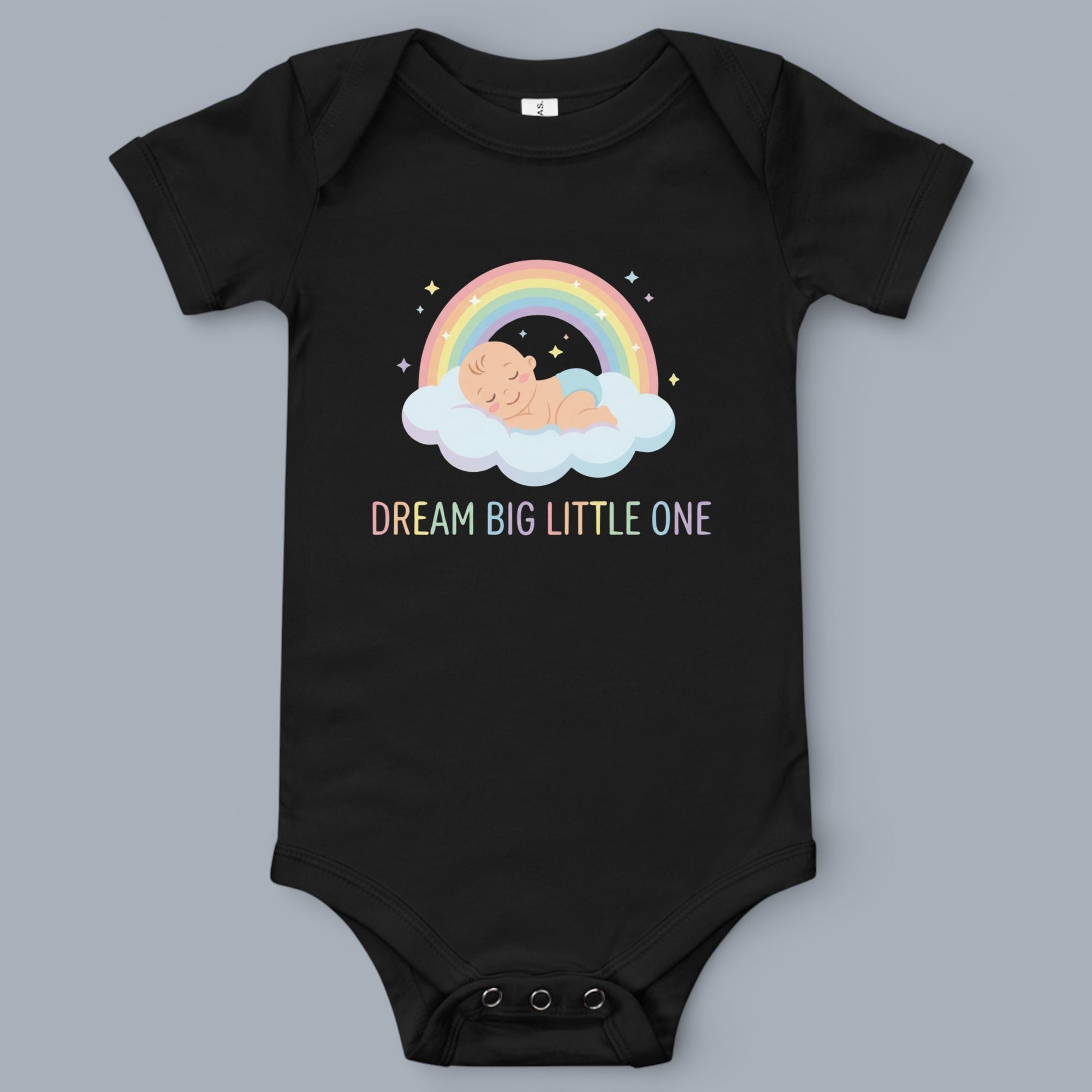 Wrap your little one in comfort and charm with this adorable black baby short sleeve one piece. Featuring a serene sleeping baby on a soft white cloud, this design is accented by a beautiful pastel rainbow and sparkling stars, creating a magical dreamscape. The delightful message 'DREAM BIG LITTLE ONE' is printed in soft, multicolored pastel letters, making it a perfect addition to your baby's wardrobe.