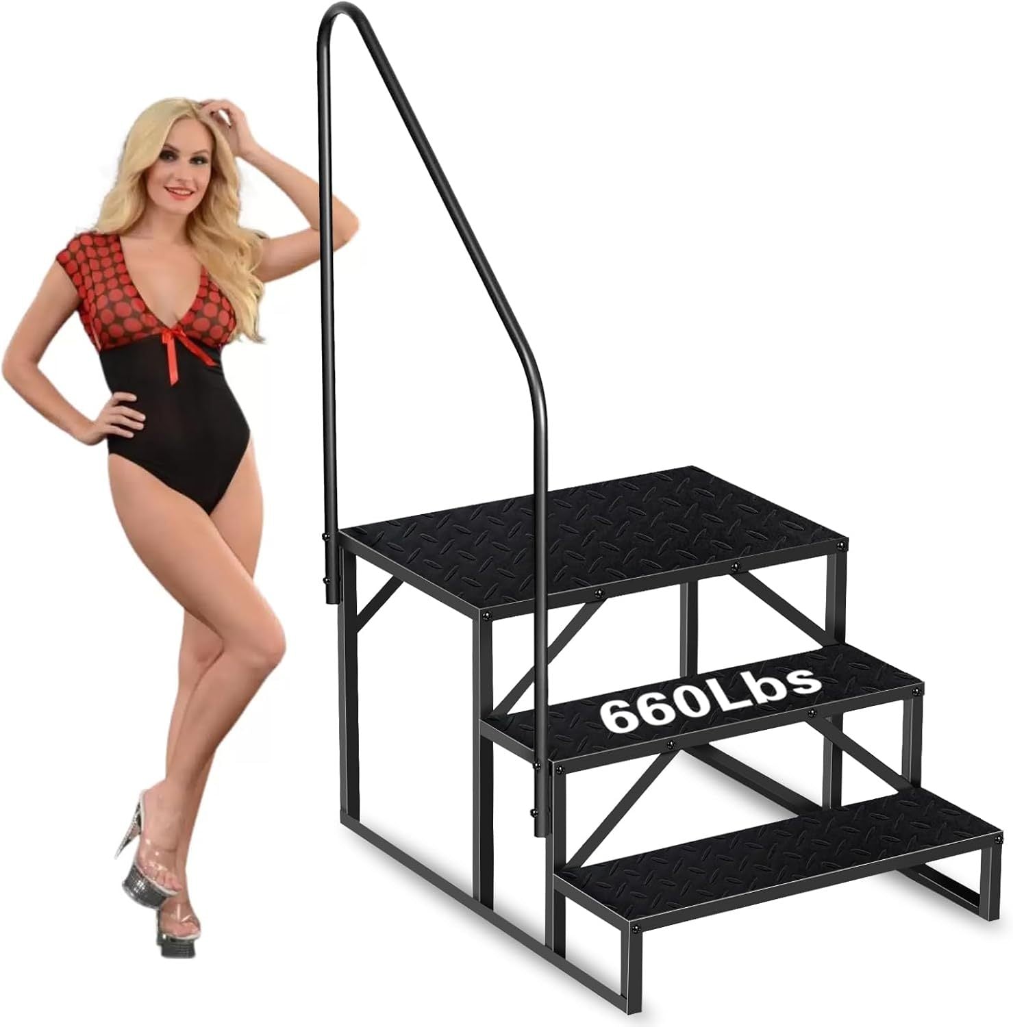 Assemble on a level surface and fully tighten all fasteners. Use the provided mounting holes to attach the handrail on the side you prefer. For temporary placement around pools or spas, confirm the base sits flat and stable before use. Do not exceed the rated 660 lb capacity. When not in use, detach rails and store the unit in a dry area to prolong the powder‑coated finish. Follow the included instructions and watch the installation video on the listing page for step‑by‑step guidance.