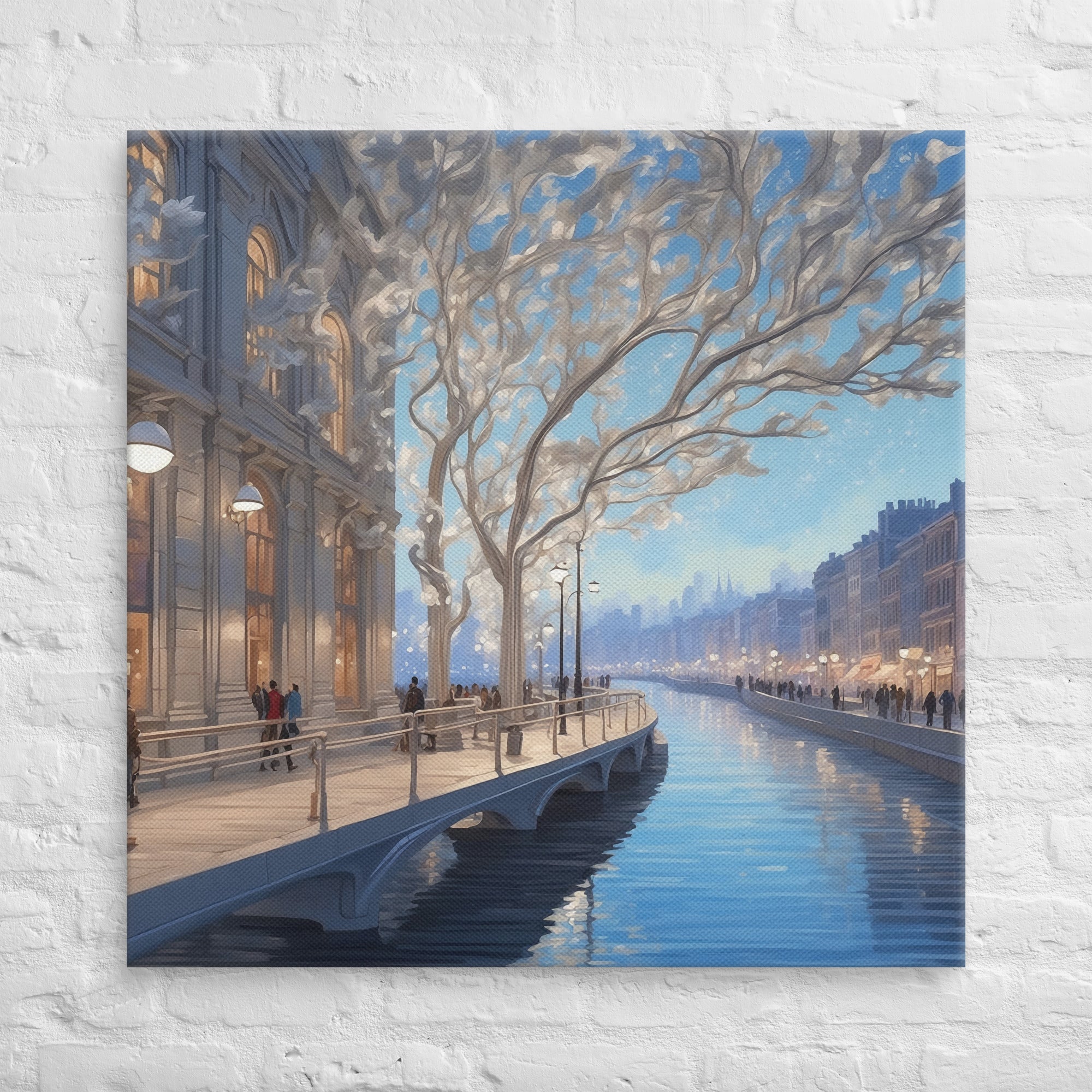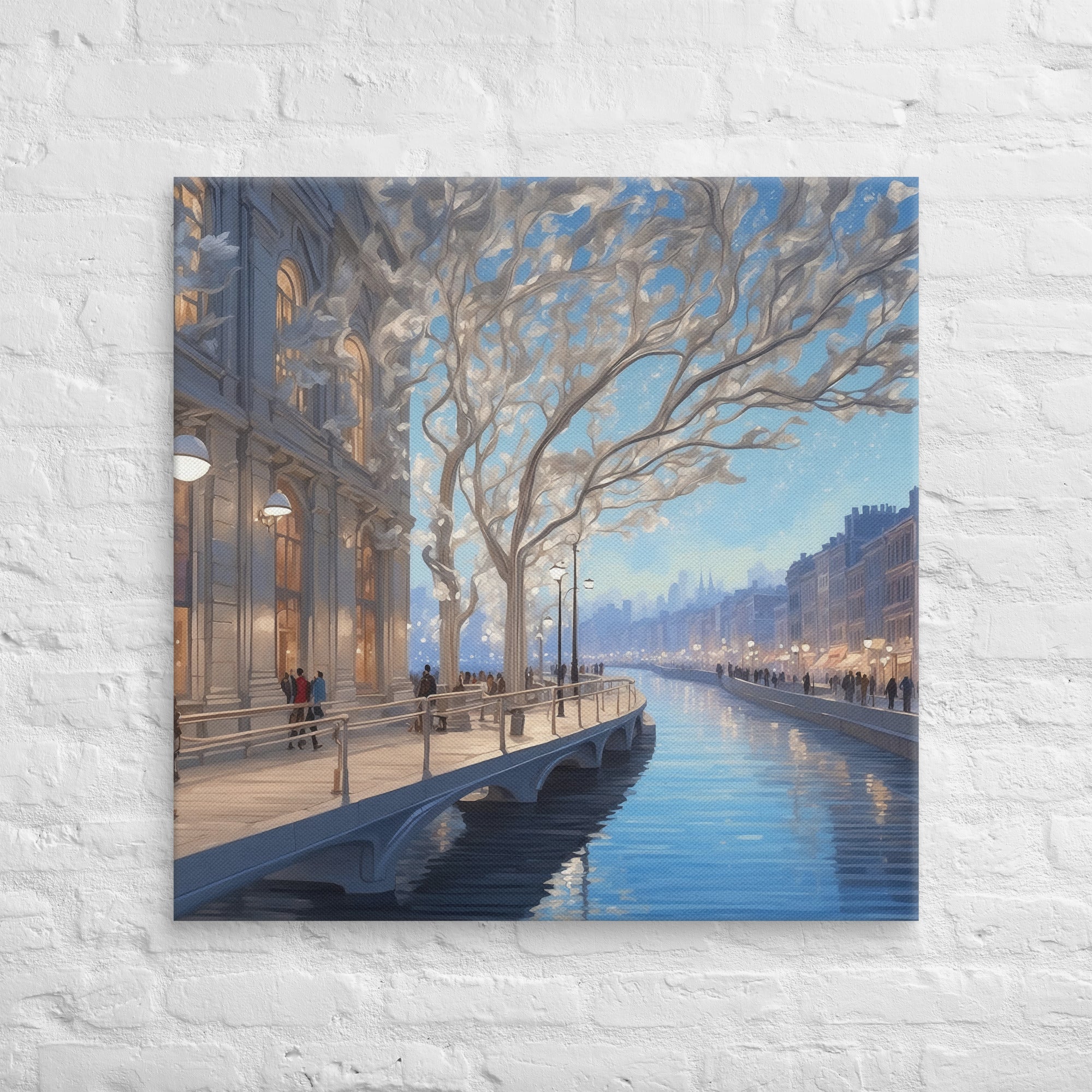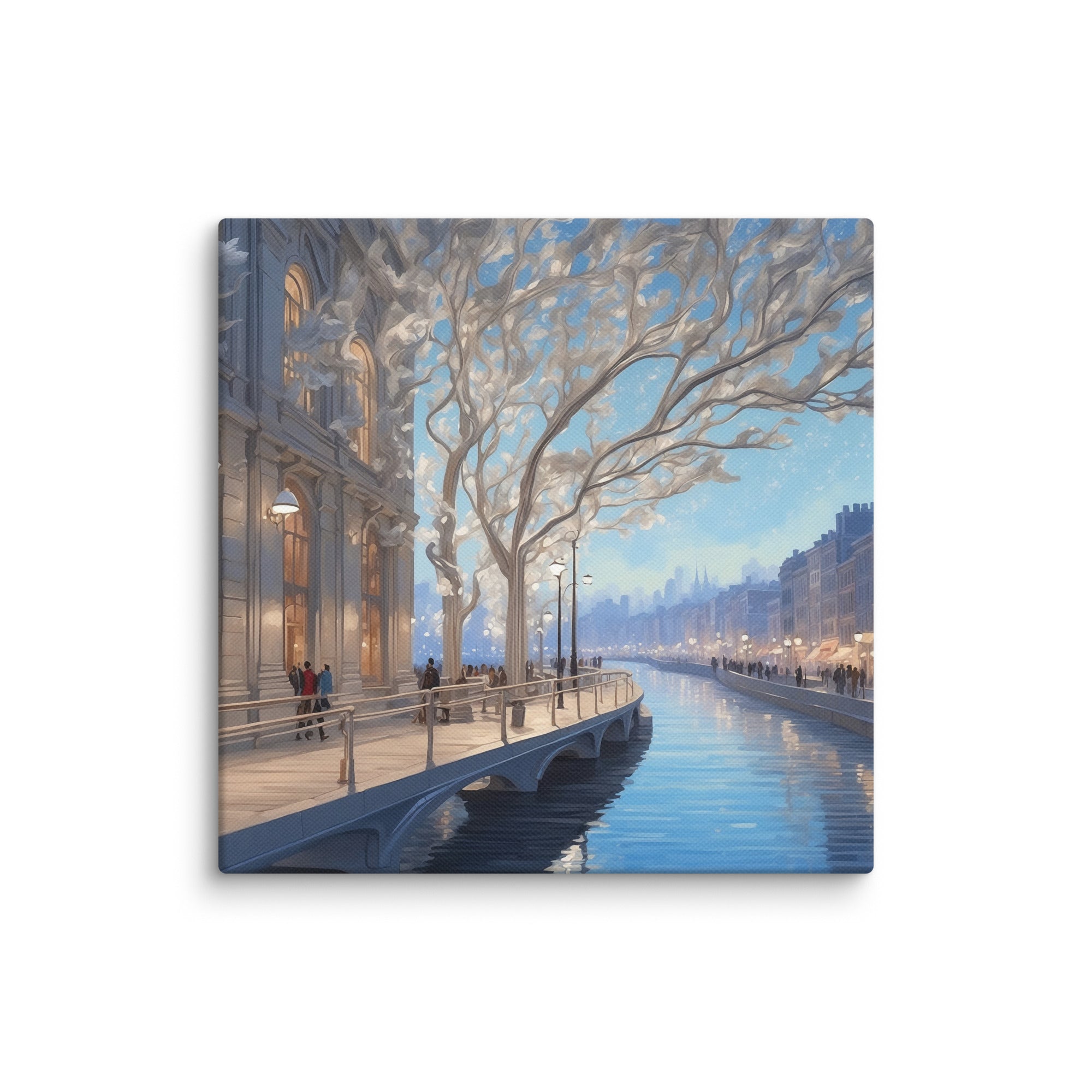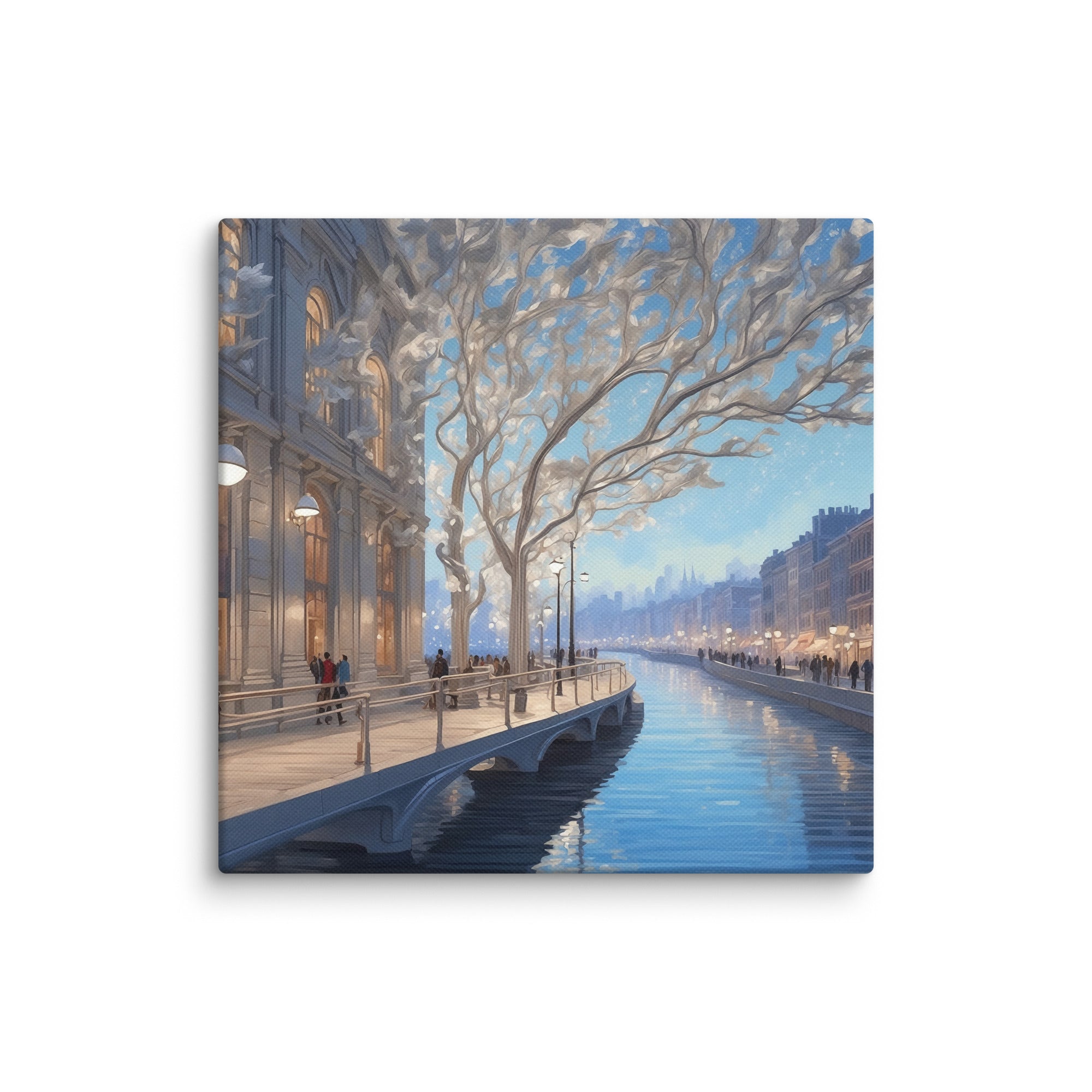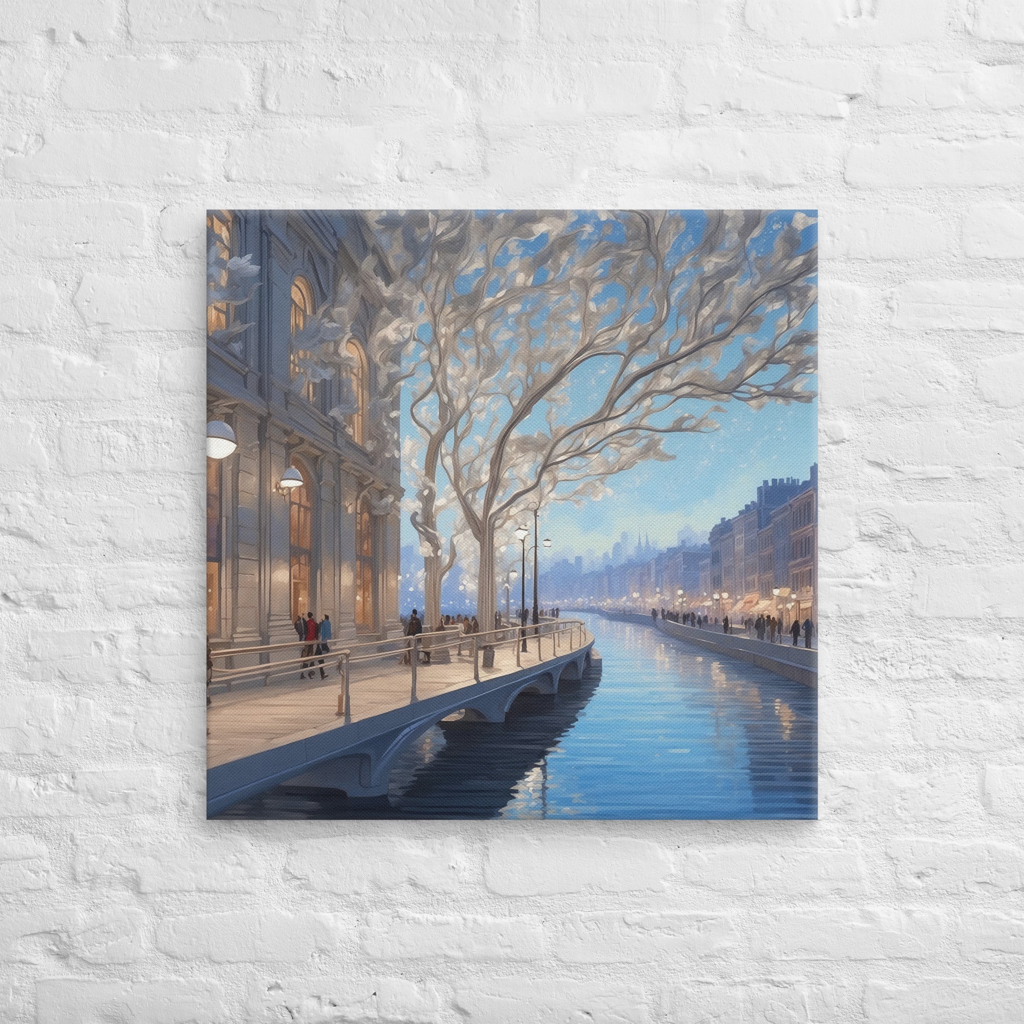 This enchanting canvas captures a dreamy cityscape along a serene canal at twilight. Glowing streetlights and softly illuminated buildings reflect in the calm waters, while delicate, frosted trees arch above the walkway, creating a sense of peace and quiet magic.
